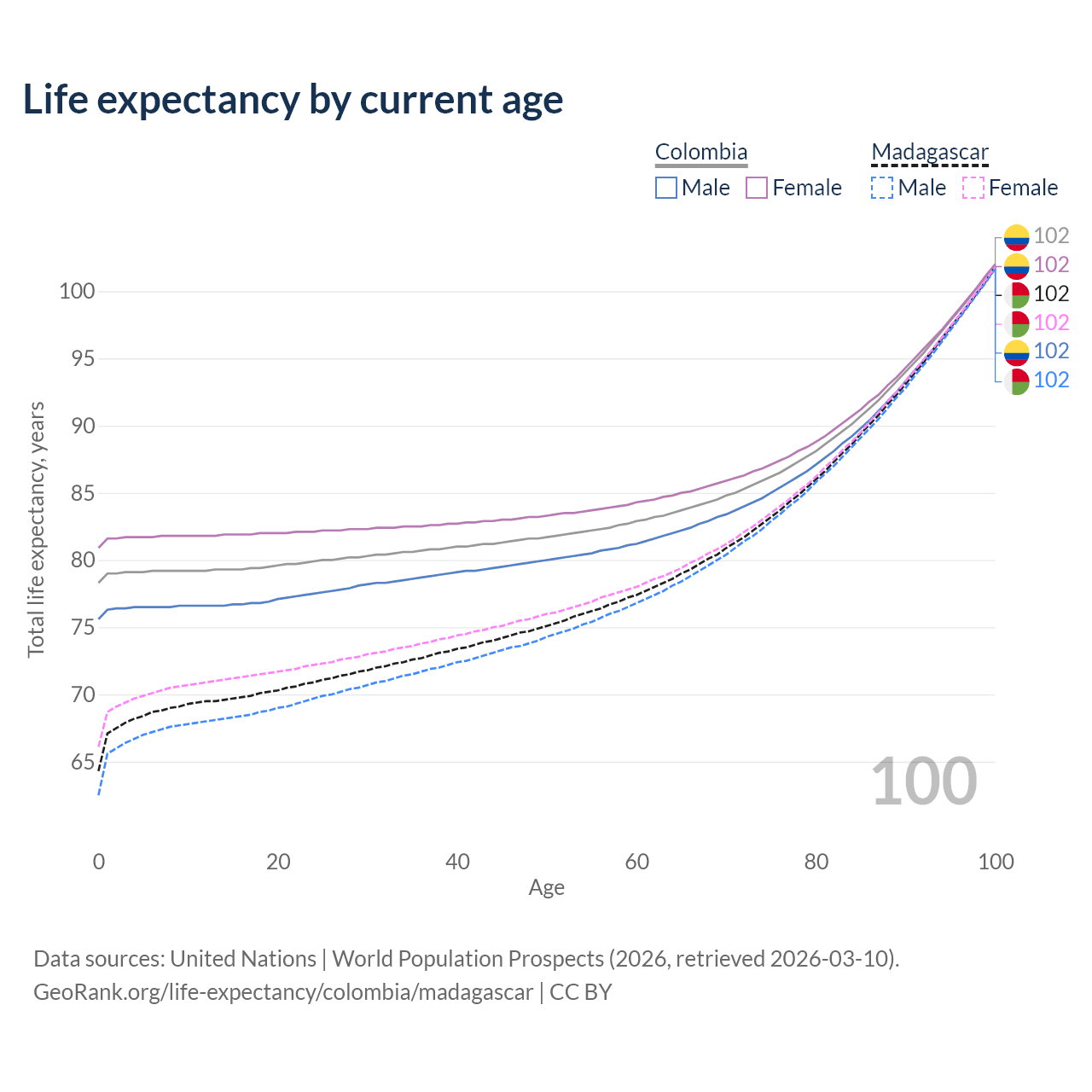 This life expectancy calculator shows the odds of living to 100, 95, 90, and below based on current age for both males and females in Colombia and Madagascar, along with mean and median age of death. The calculations are based on the 2026 life tables (actuarial tables) from the UN World Population Prospects.