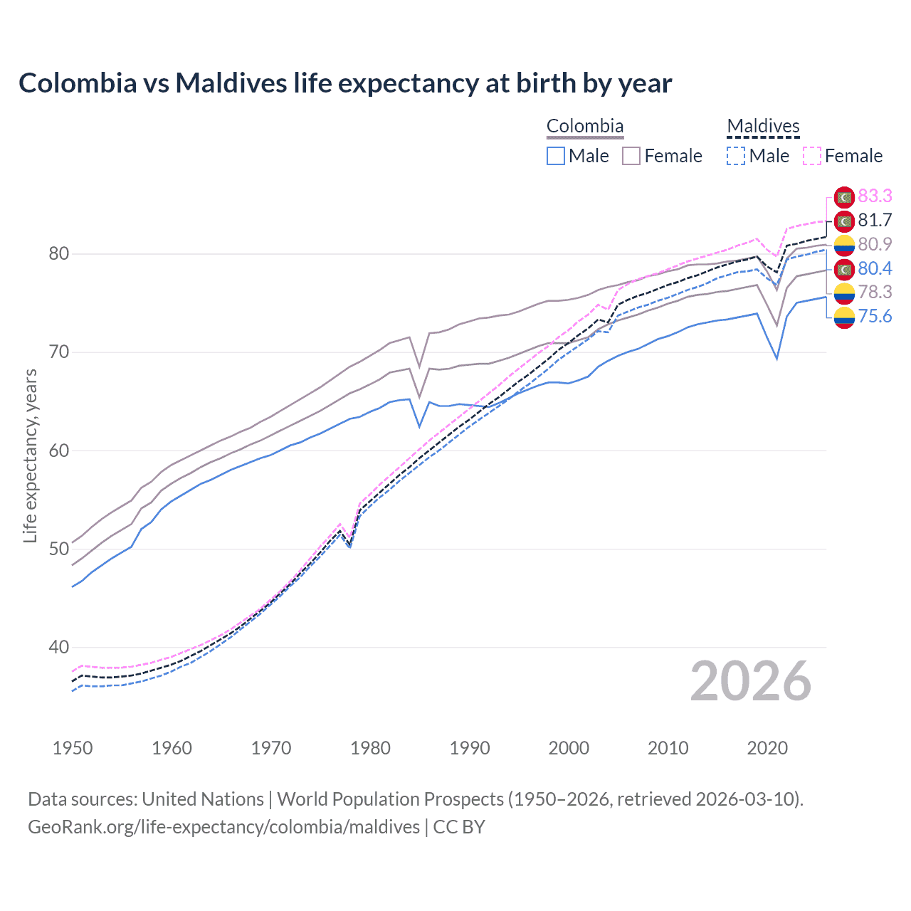 The average life expectancy at birth is 78.3 years in Colombia vs 81.7 in Maldives. Colombia is ranked 60/197 by life expectancy, and Maldives is 37/197. In Colombia, the life expectancy is 75.6 years for males and 80.9 years for females. In Maldives, it's 80.4 years for males and 83.3 years for females.
