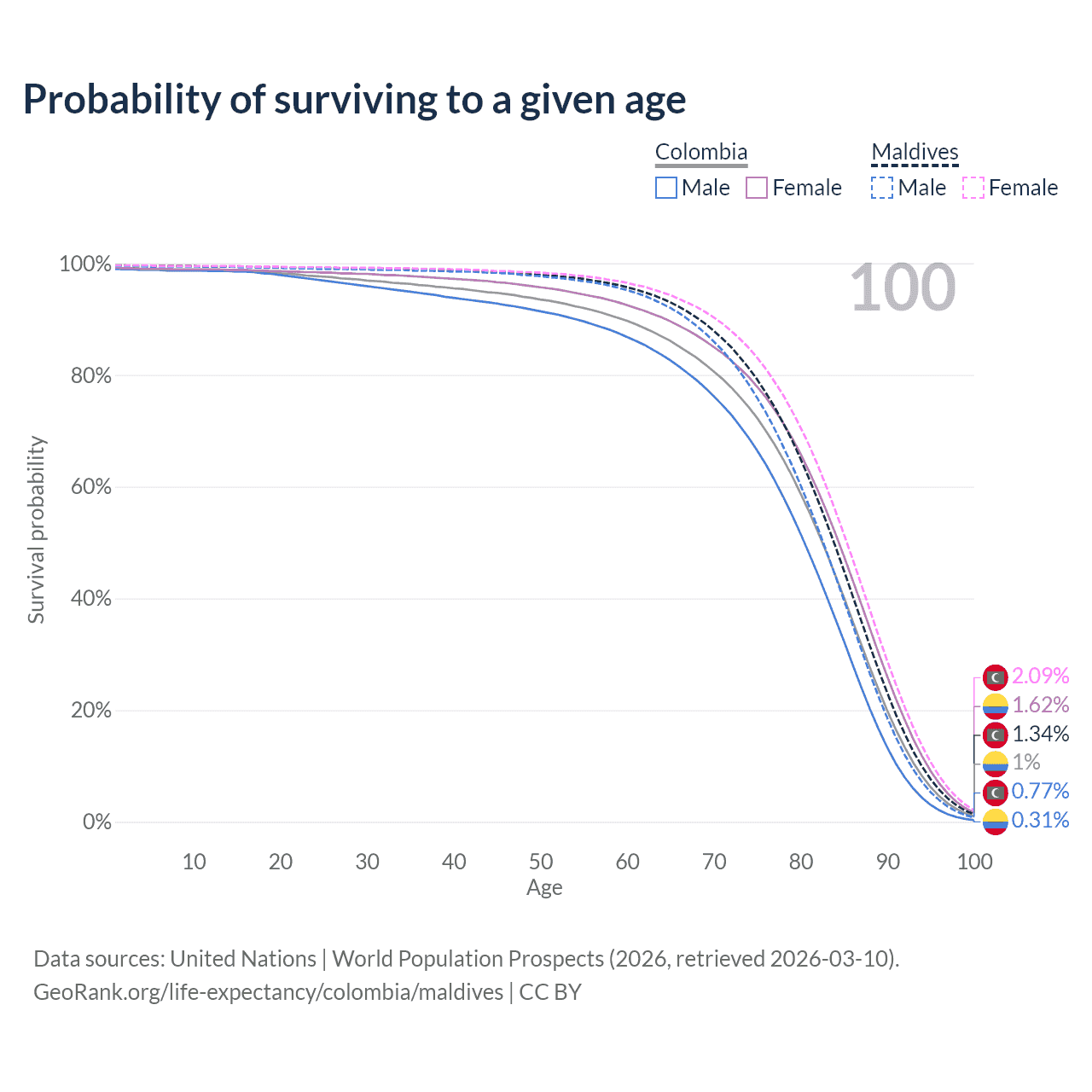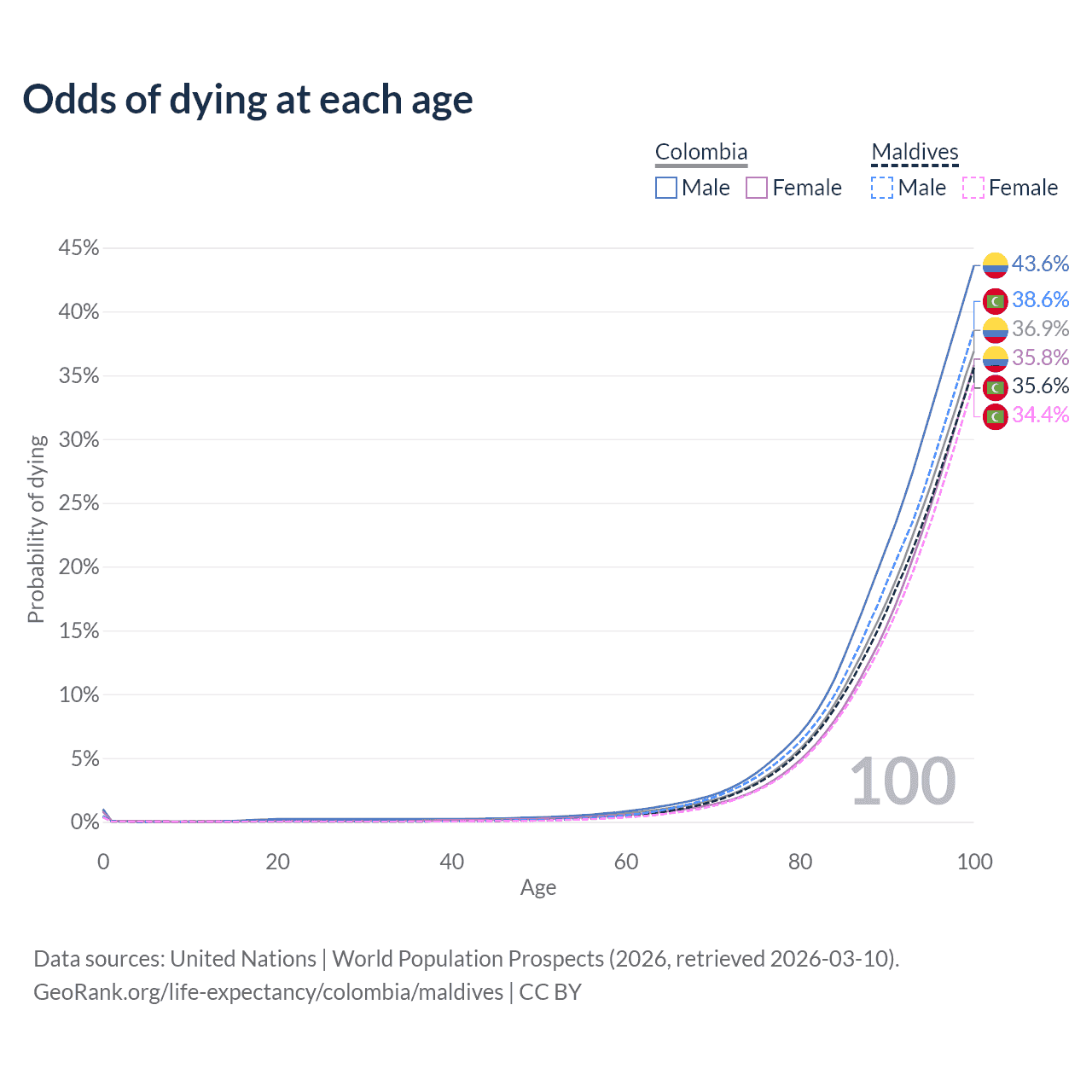This life expectancy calculator shows the odds of living to 100, 95, 90, and below based on current age for both males and females in Colombia and Maldives, along with mean and median age of death. The calculations are based on the 2026 life tables (actuarial tables) from the UN World Population Prospects.