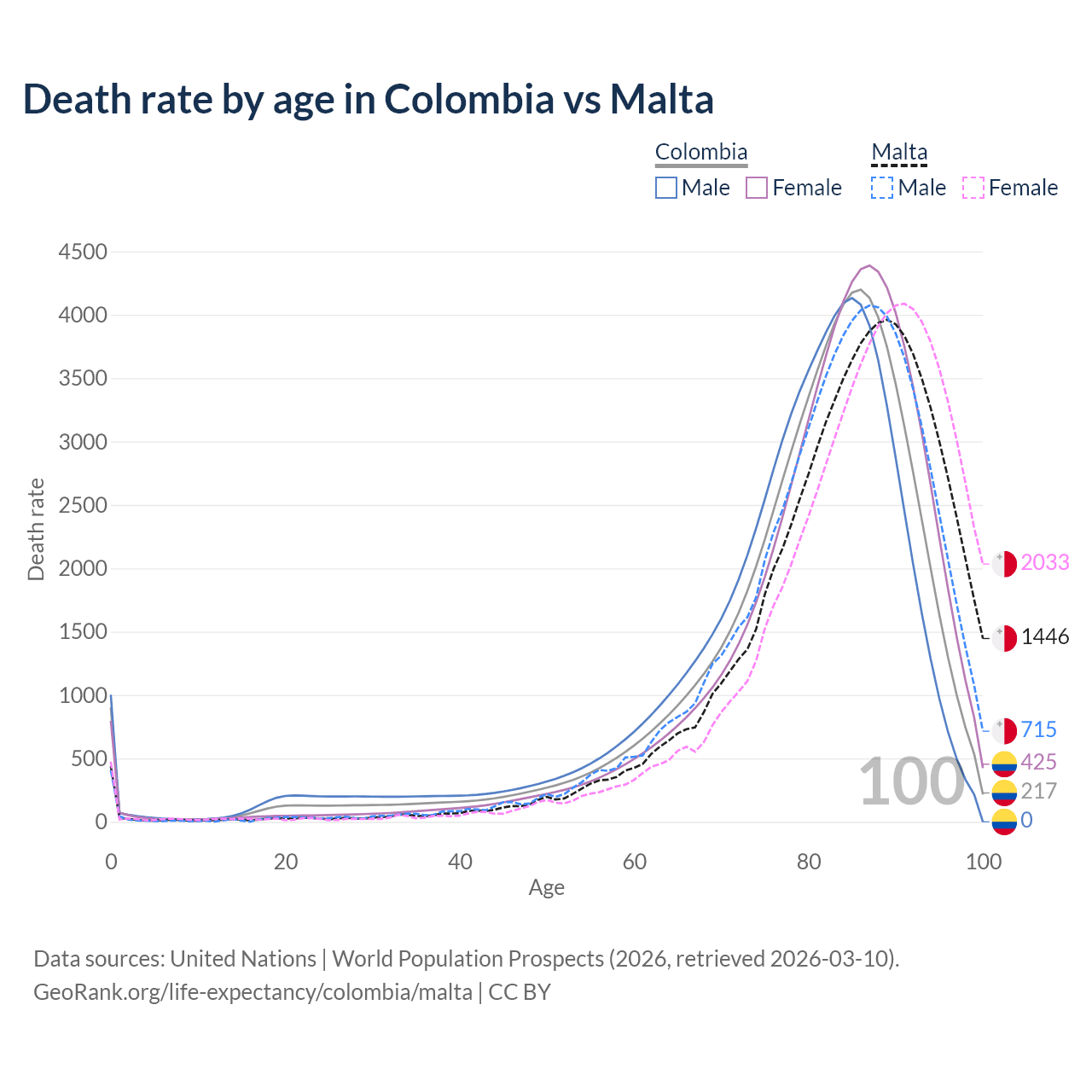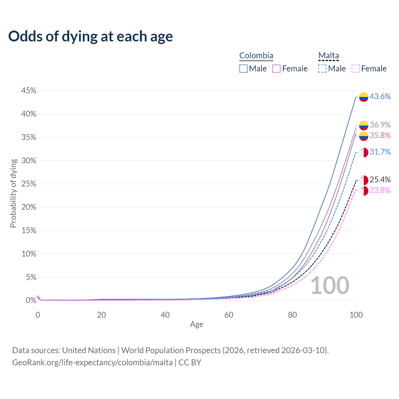This life expectancy calculator shows the odds of living to 100, 95, 90, and below based on current age for both males and females in Colombia and Malta, along with mean and median age of death. The calculations are based on the 2026 life tables (actuarial tables) from the UN World Population Prospects.