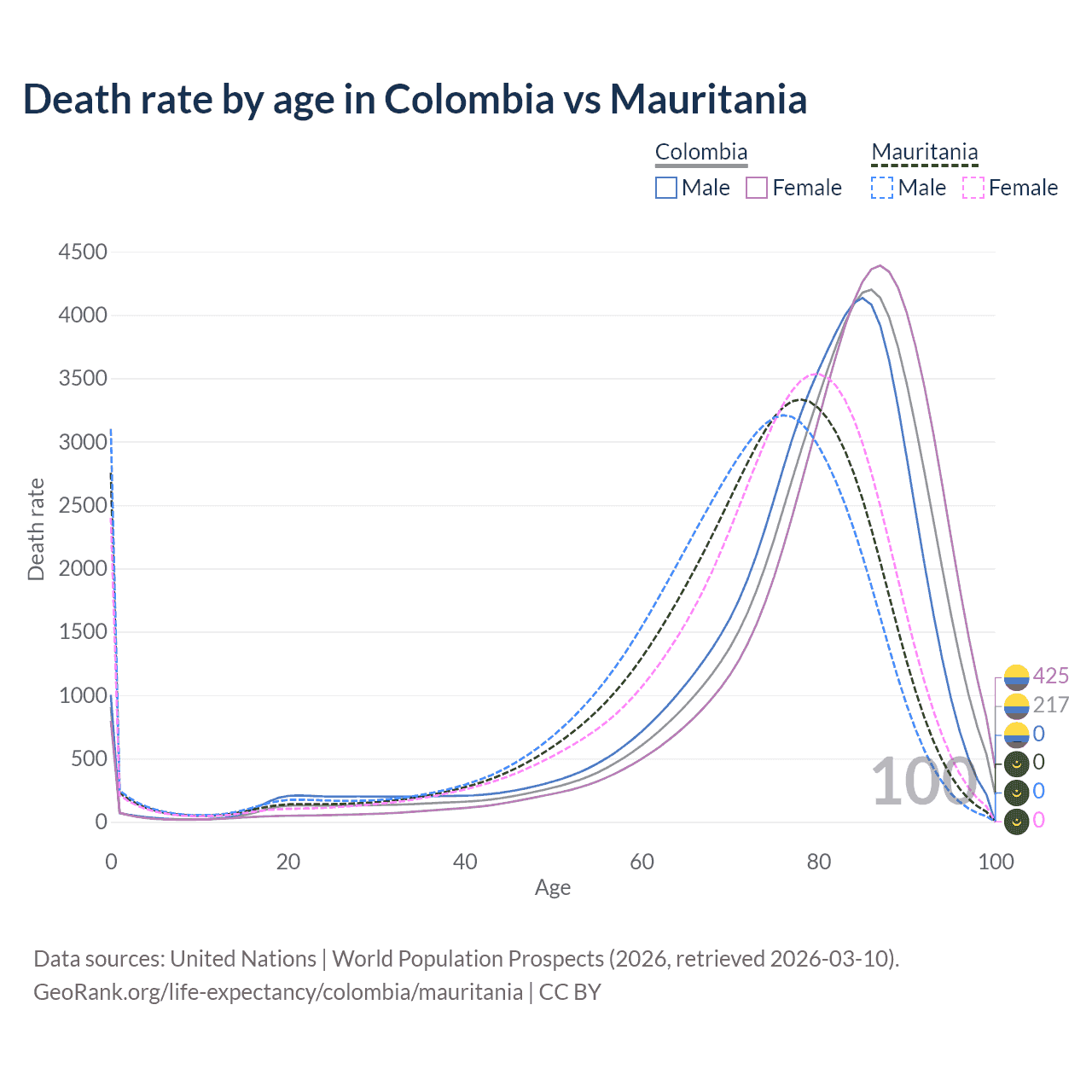 In Colombia, the most common age of death is 86, compared to 78 in Mauritania. The median age of death is 82.5 in Colombia and 74.1 in Mauritania, meaning only half of each cohort is expected to live past that age.