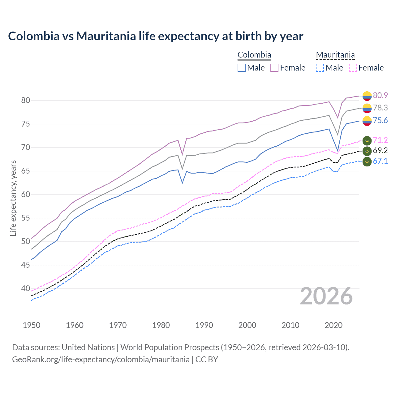 The average life expectancy at birth is 78.3 years in Colombia vs 69.2 in Mauritania. Colombia is ranked 60/197 by life expectancy, and Mauritania is 144/197. In Colombia, the life expectancy is 75.6 years for males and 80.9 years for females. In Mauritania, it's 67.1 years for males and 71.2 years for females.