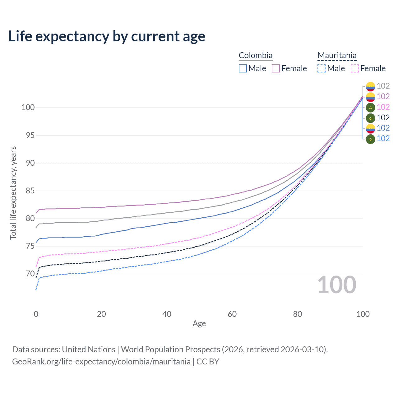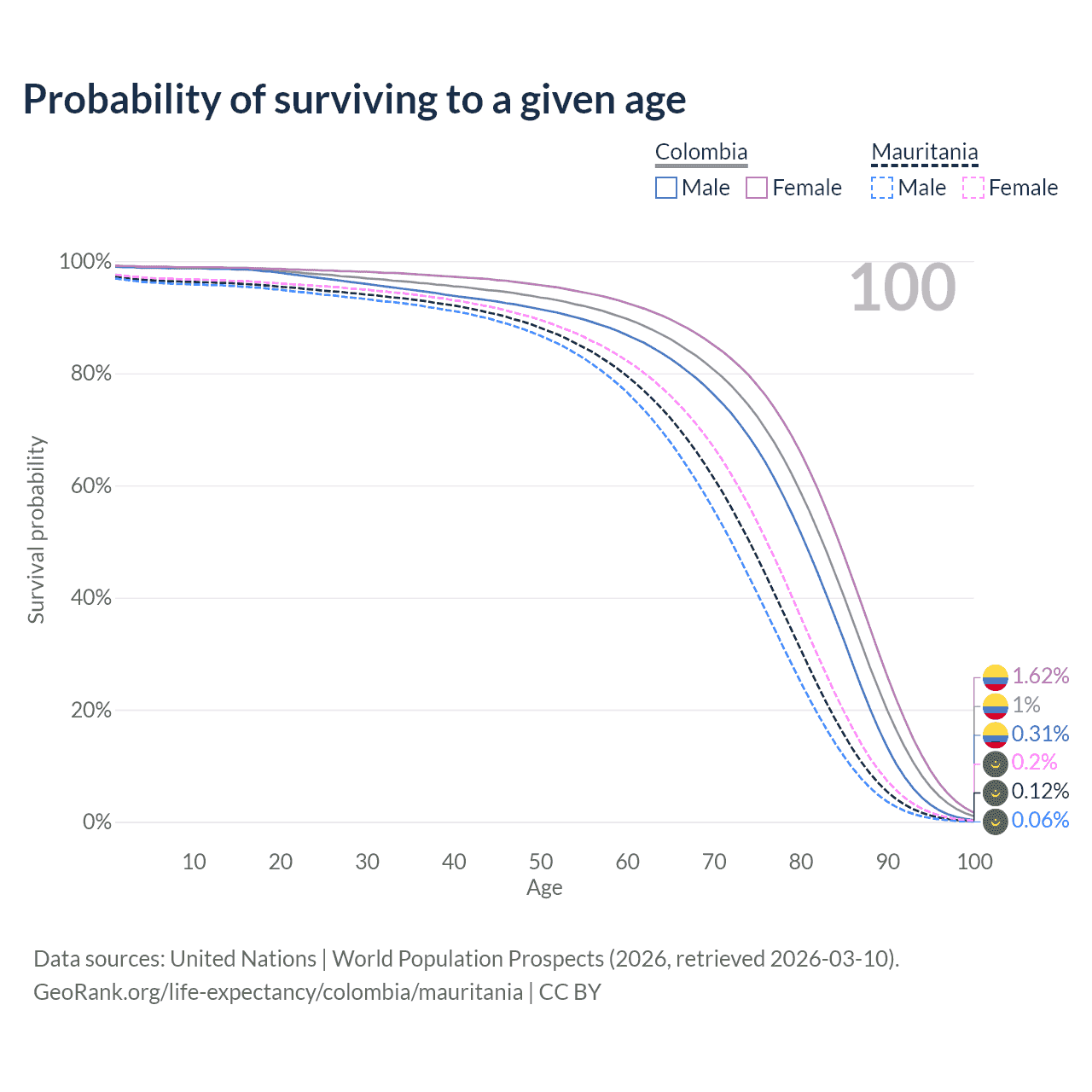 This life expectancy calculator shows the odds of living to 100, 95, 90, and below based on current age for both males and females in Colombia and Mauritania, along with mean and median age of death. The calculations are based on the 2026 life tables (actuarial tables) from the UN World Population Prospects.