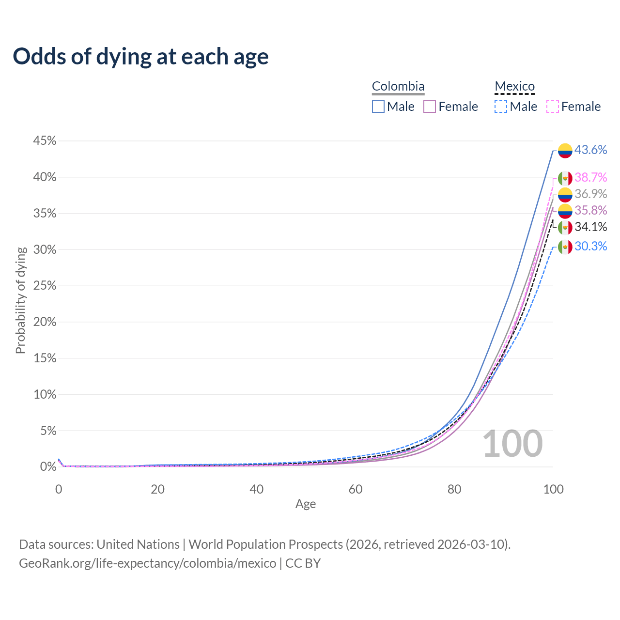 This life expectancy calculator shows the odds of living to 100, 95, 90, and below based on current age for both males and females in Colombia and Mexico, along with mean and median age of death. The calculations are based on the 2026 life tables (actuarial tables) from the UN World Population Prospects.