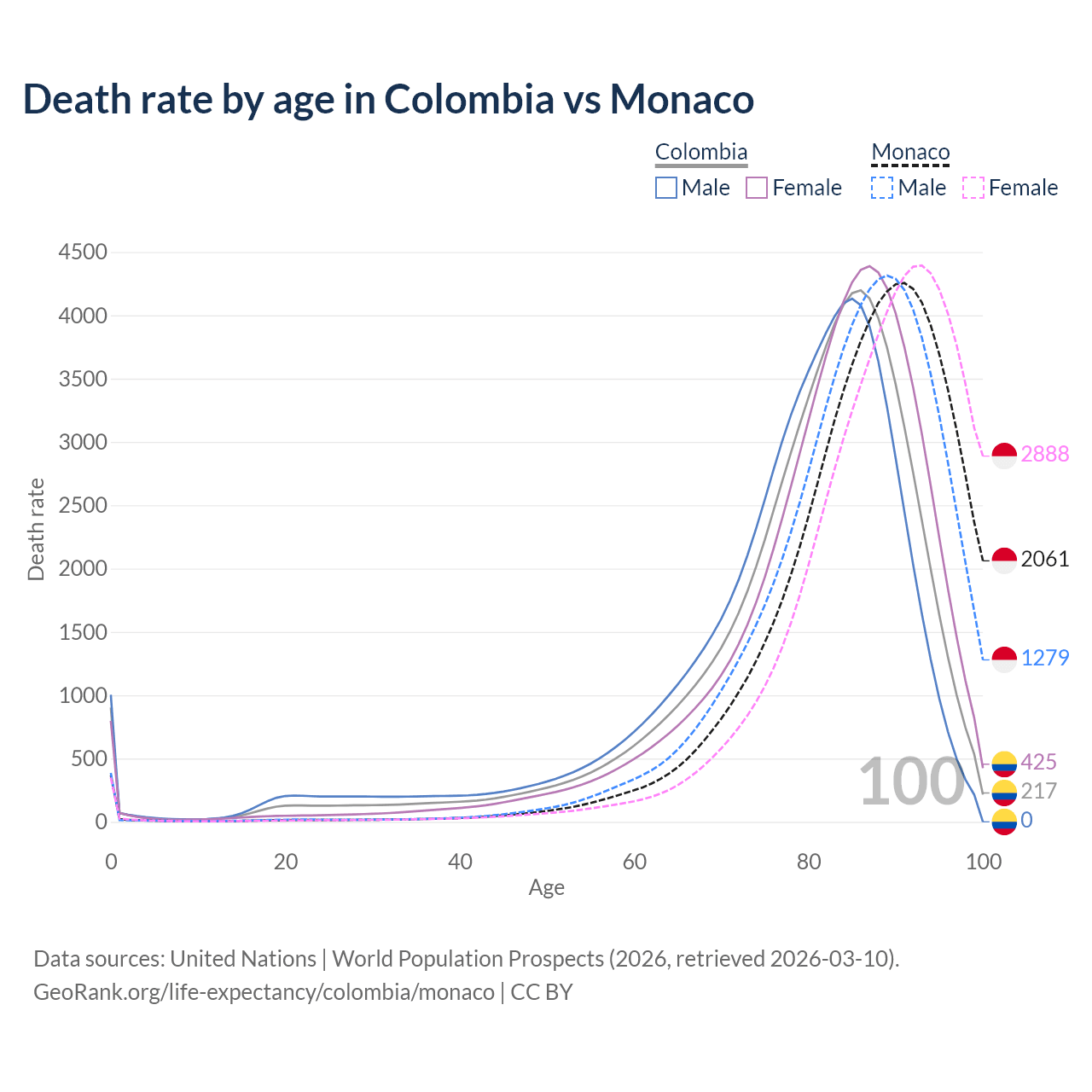 In Colombia, the most common age of death is 86, compared to 91 in Monaco. The median age of death is 82.5 in Colombia and 88.7 in Monaco, meaning only half of each cohort is expected to live past that age.