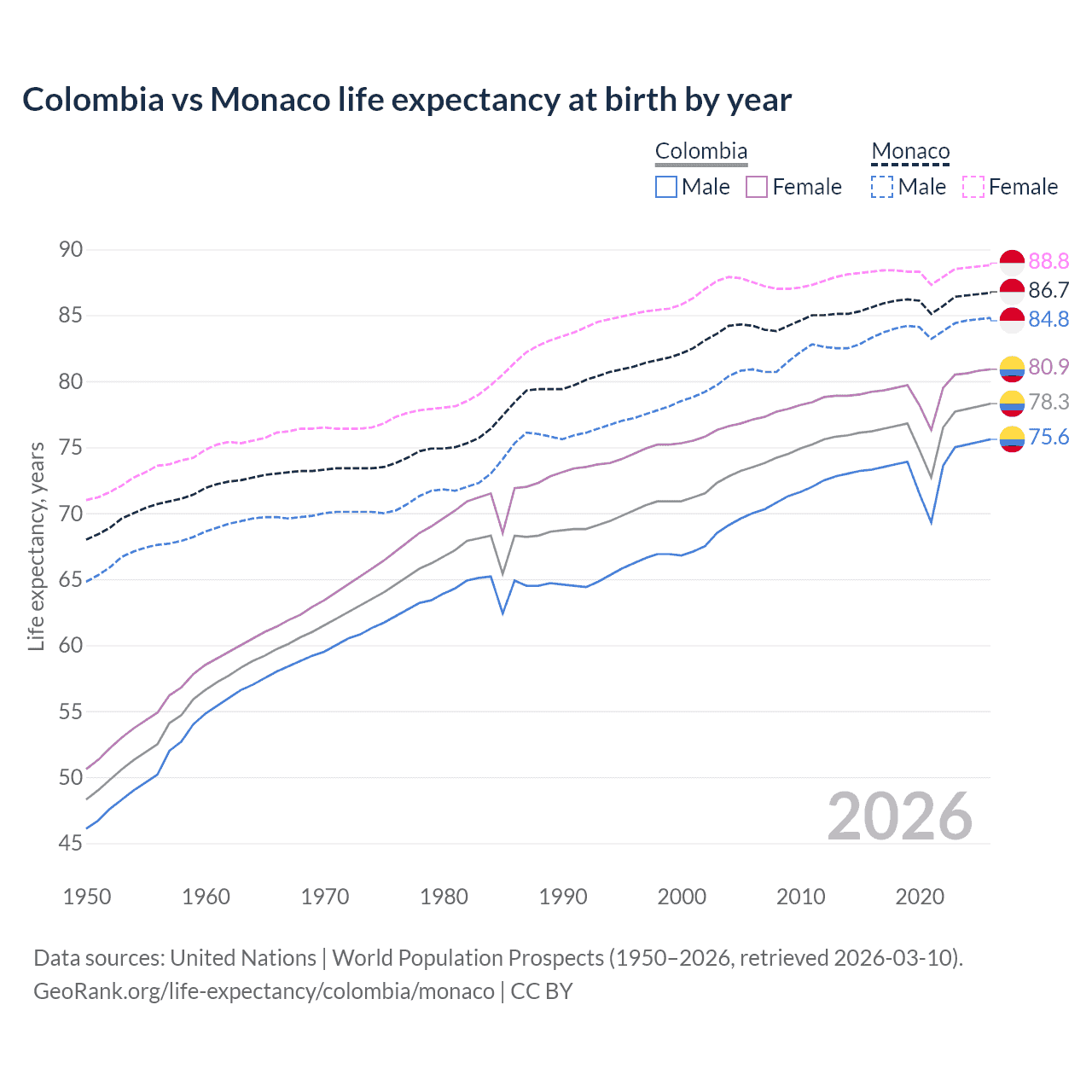 The average life expectancy at birth is 78.3 years in Colombia vs 86.7 in Monaco. Colombia is ranked 60/197 by life expectancy, and Monaco is 1/197. In Colombia, the life expectancy is 75.6 years for males and 80.9 years for females. In Monaco, it's 84.8 years for males and 88.8 years for females.