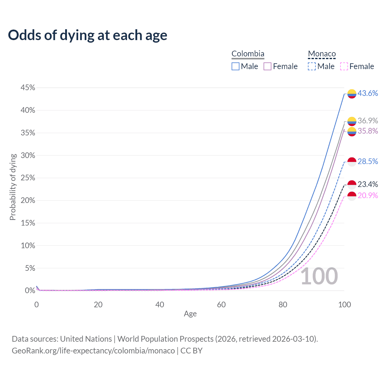 This life expectancy calculator shows the odds of living to 100, 95, 90, and below based on current age for both males and females in Colombia and Monaco, along with mean and median age of death. The calculations are based on the 2026 life tables (actuarial tables) from the UN World Population Prospects.