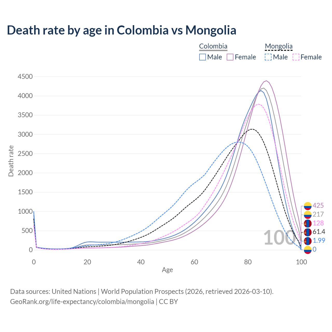 In Colombia, the most common age of death is 86, compared to 82 in Mongolia. The median age of death is 82.5 in Colombia and 76 in Mongolia, meaning only half of each cohort is expected to live past that age.
