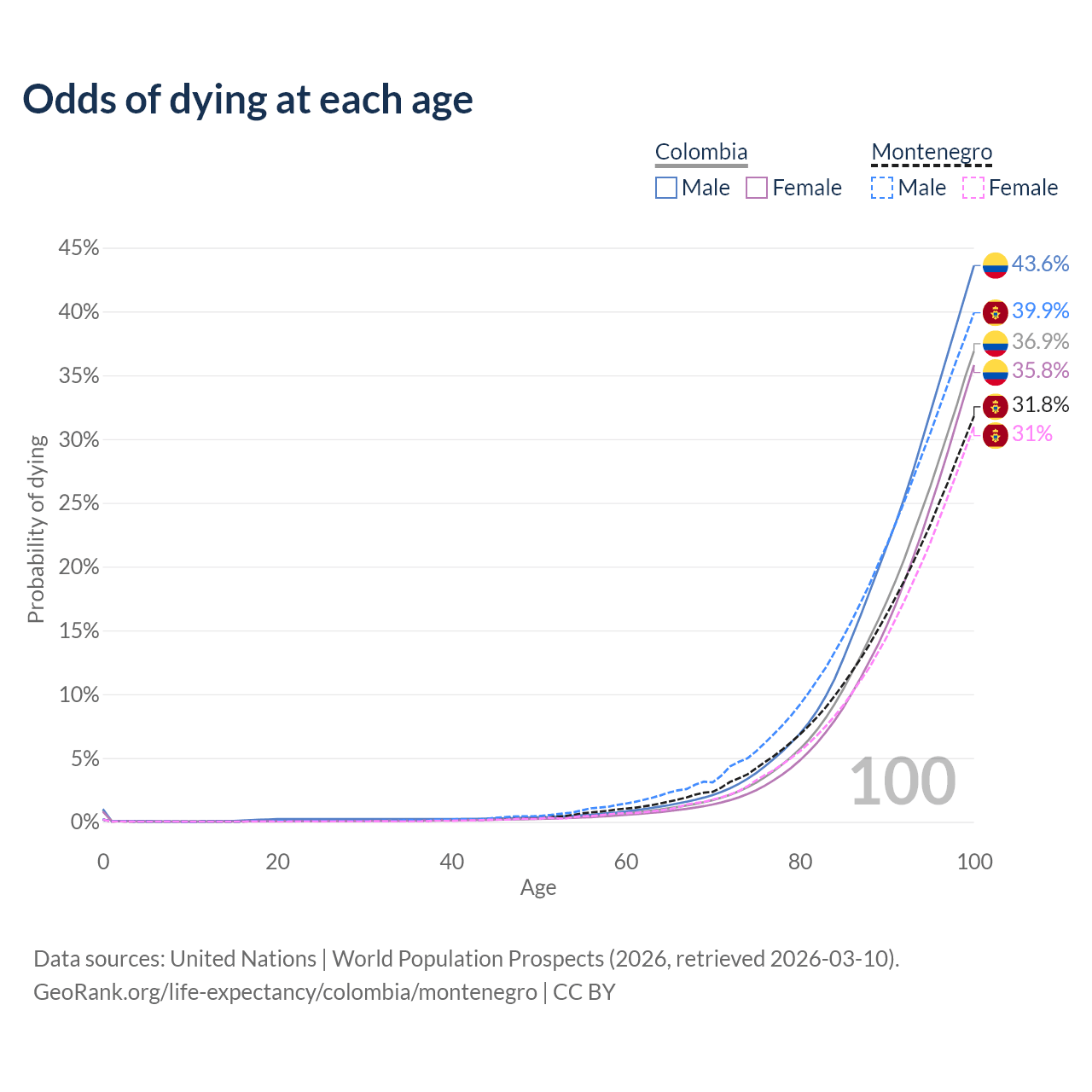 This life expectancy calculator shows the odds of living to 100, 95, 90, and below based on current age for both males and females in Colombia and Montenegro, along with mean and median age of death. The calculations are based on the 2026 life tables (actuarial tables) from the UN World Population Prospects.