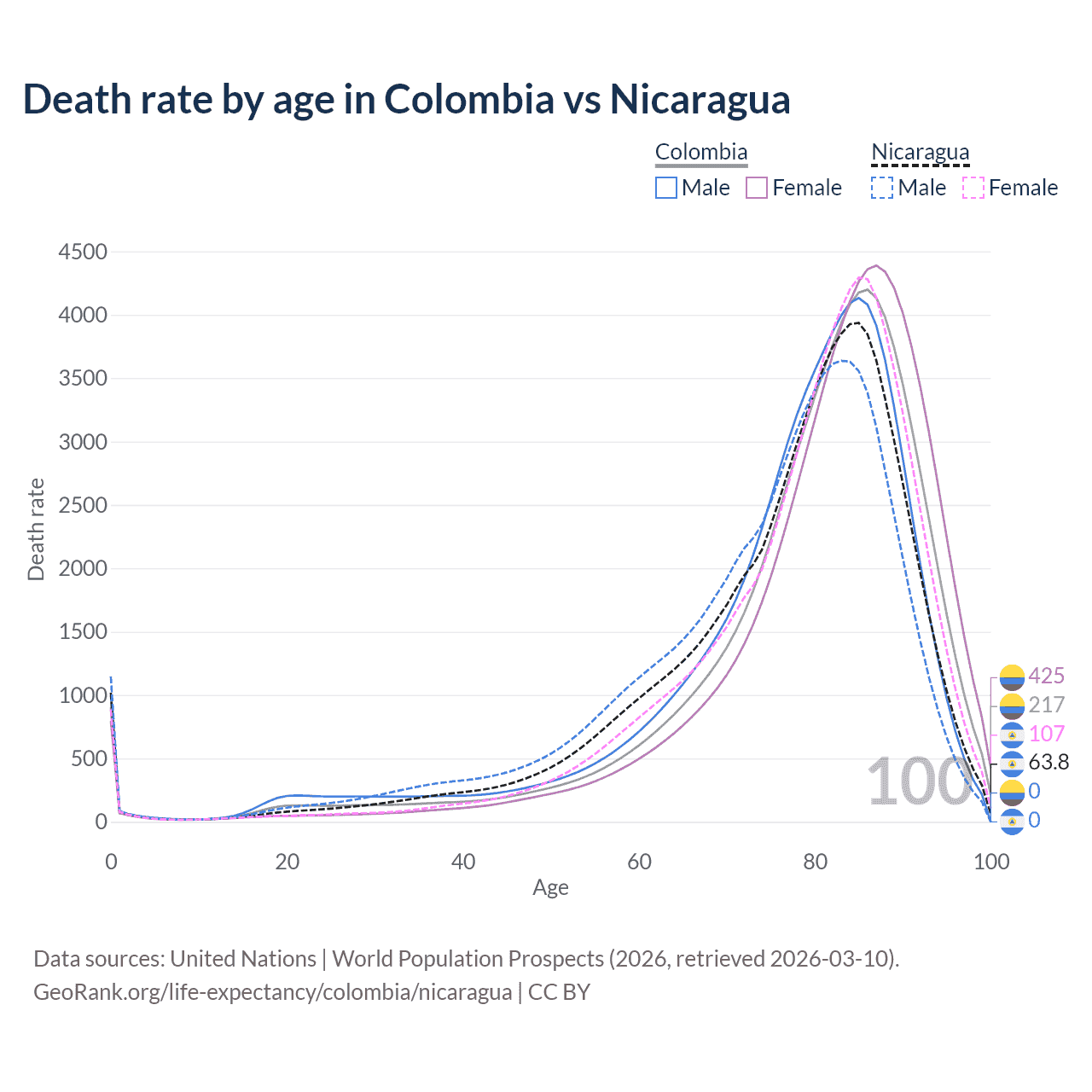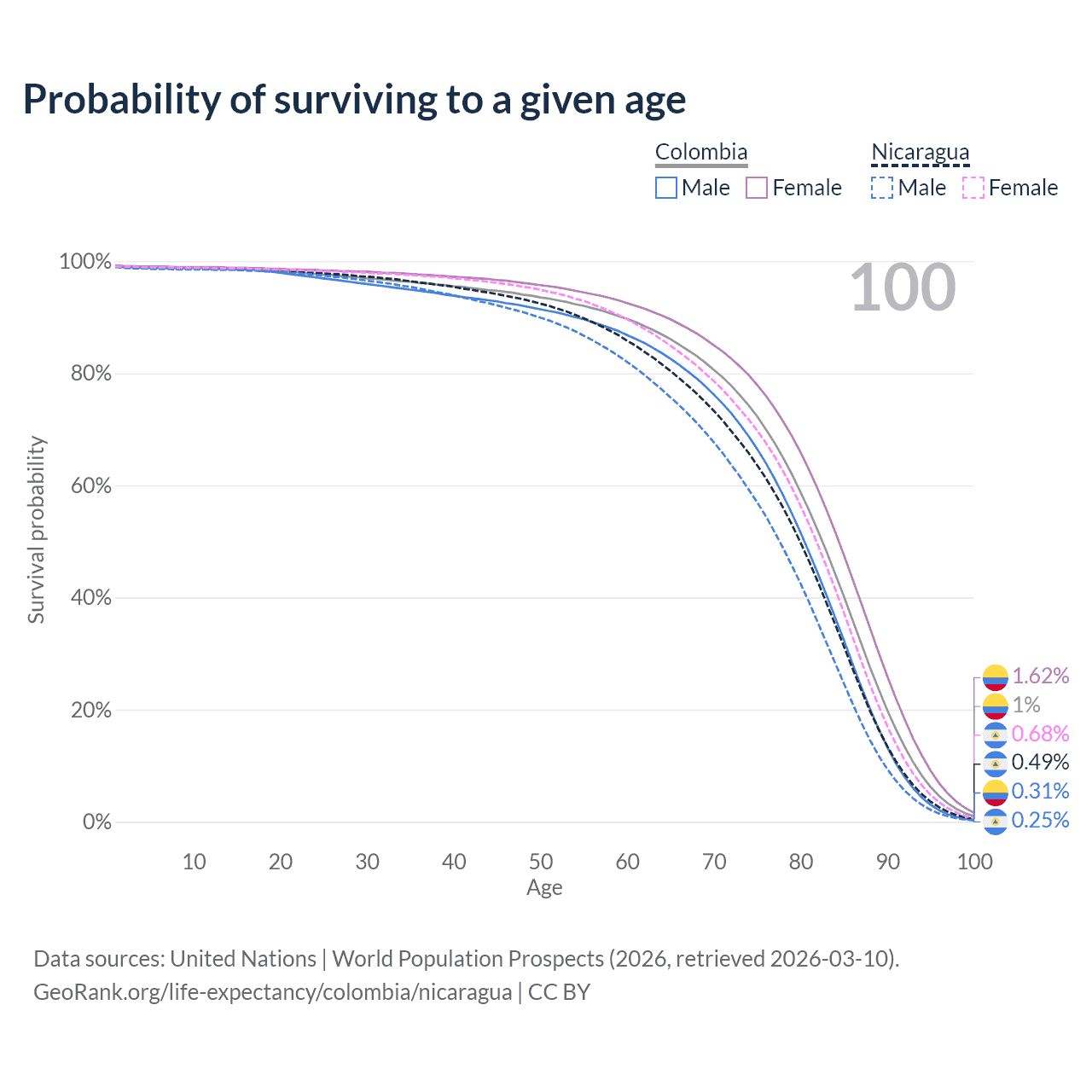 This life expectancy calculator shows the odds of living to 100, 95, 90, and below based on current age for both males and females in Colombia and Nicaragua, along with mean and median age of death. The calculations are based on the 2026 life tables (actuarial tables) from the UN World Population Prospects.