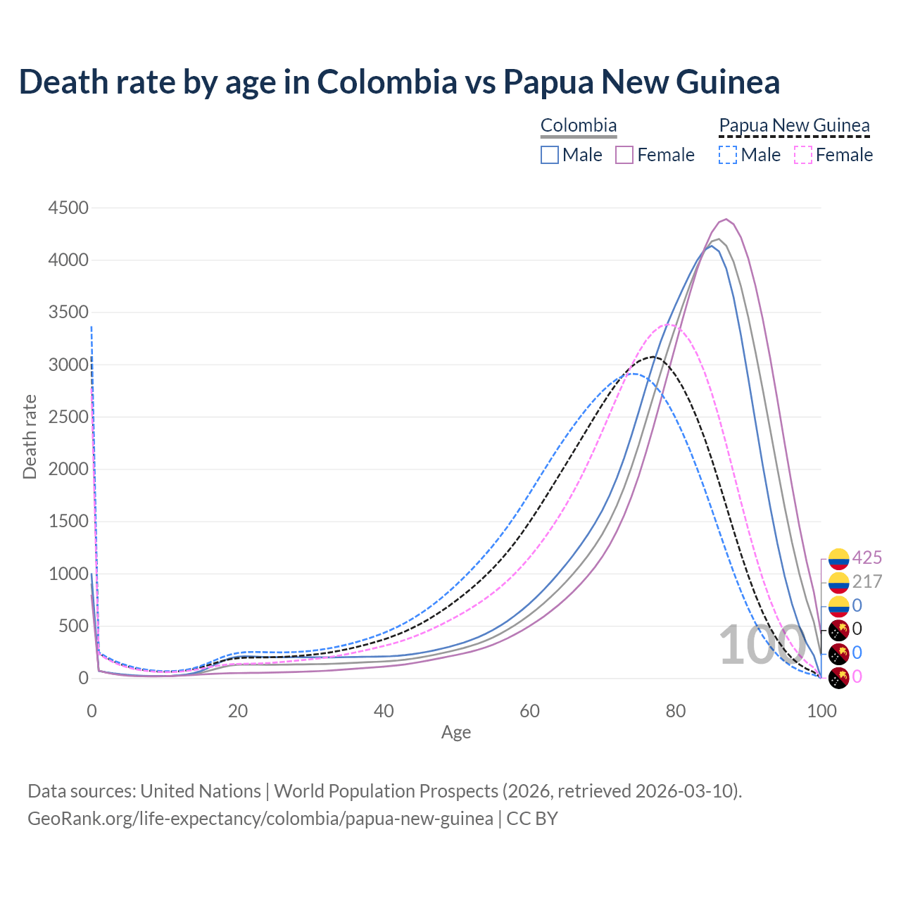 In Colombia, the most common age of death is 86, compared to 0 in Papua New Guinea. The median age of death is 82.5 in Colombia and 71.7 in Papua New Guinea, meaning only half of each cohort is expected to live past that age.