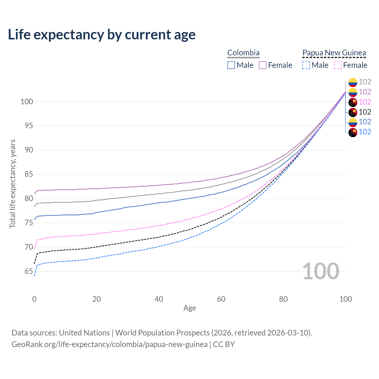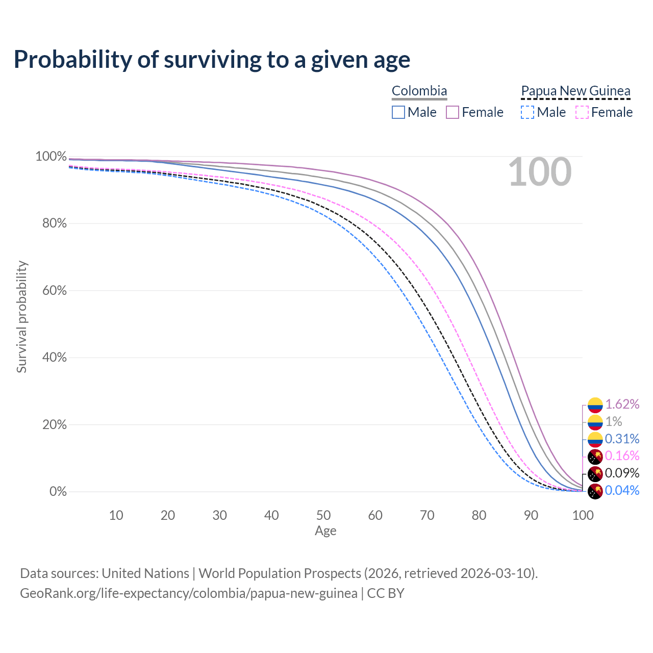 This life expectancy calculator shows the odds of living to 100, 95, 90, and below based on current age for both males and females in Colombia and Papua New Guinea, along with mean and median age of death. The calculations are based on the 2026 life tables (actuarial tables) from the UN World Population Prospects.