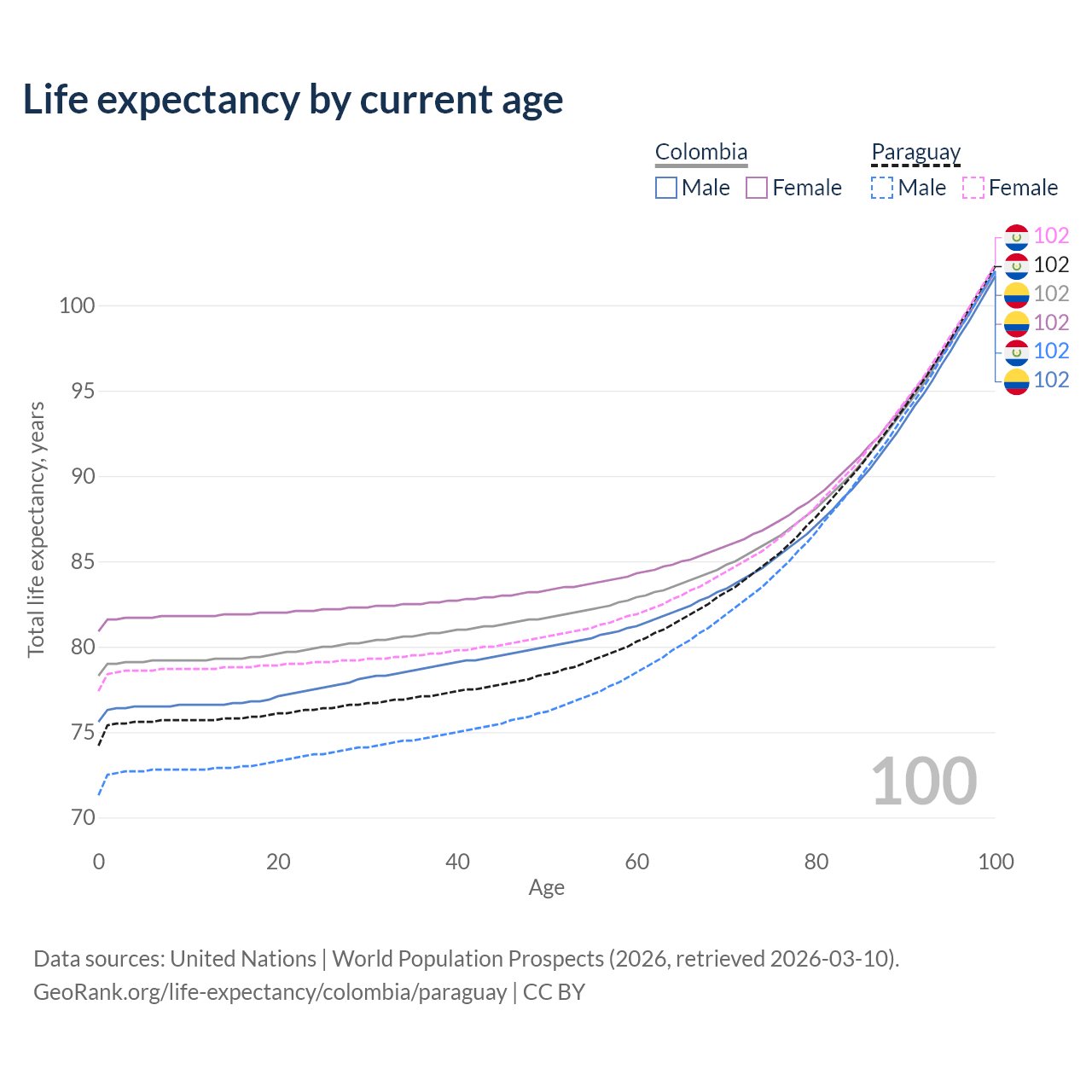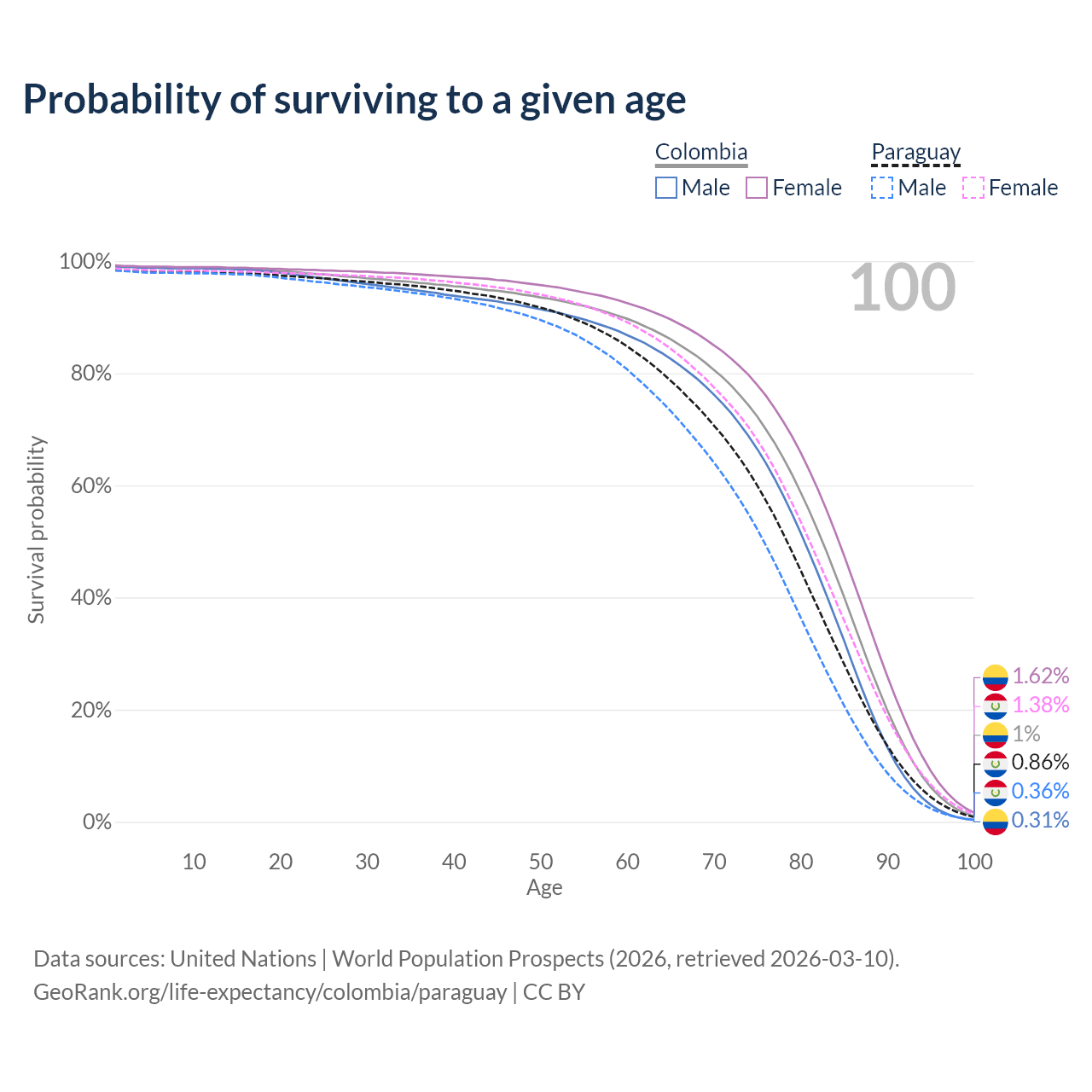 This life expectancy calculator shows the odds of living to 100, 95, 90, and below based on current age for both males and females in Colombia and Paraguay, along with mean and median age of death. The calculations are based on the 2026 life tables (actuarial tables) from the UN World Population Prospects.
