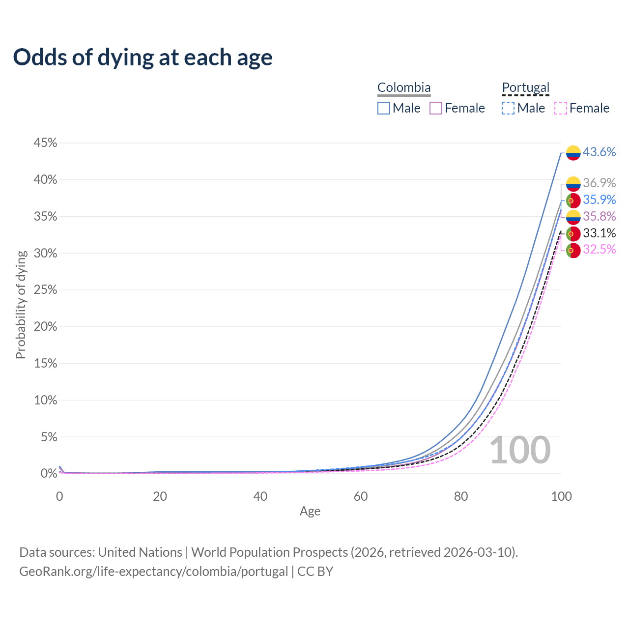 This life expectancy calculator shows the odds of living to 100, 95, 90, and below based on current age for both males and females in Colombia and Portugal, along with mean and median age of death. The calculations are based on the 2026 life tables (actuarial tables) from the UN World Population Prospects.