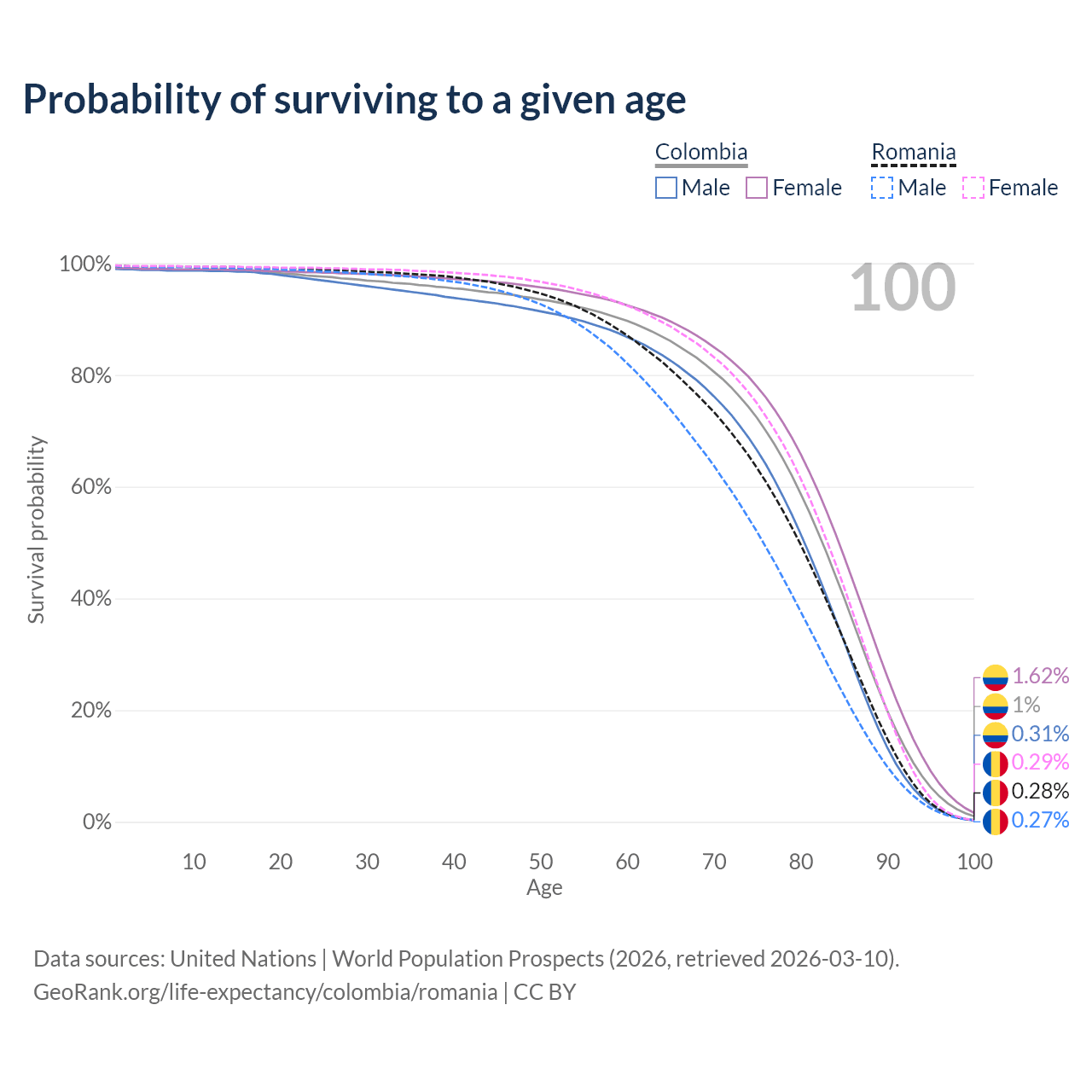 This life expectancy calculator shows the odds of living to 100, 95, 90, and below based on current age for both males and females in Colombia and Romania, along with mean and median age of death. The calculations are based on the 2026 life tables (actuarial tables) from the UN World Population Prospects.