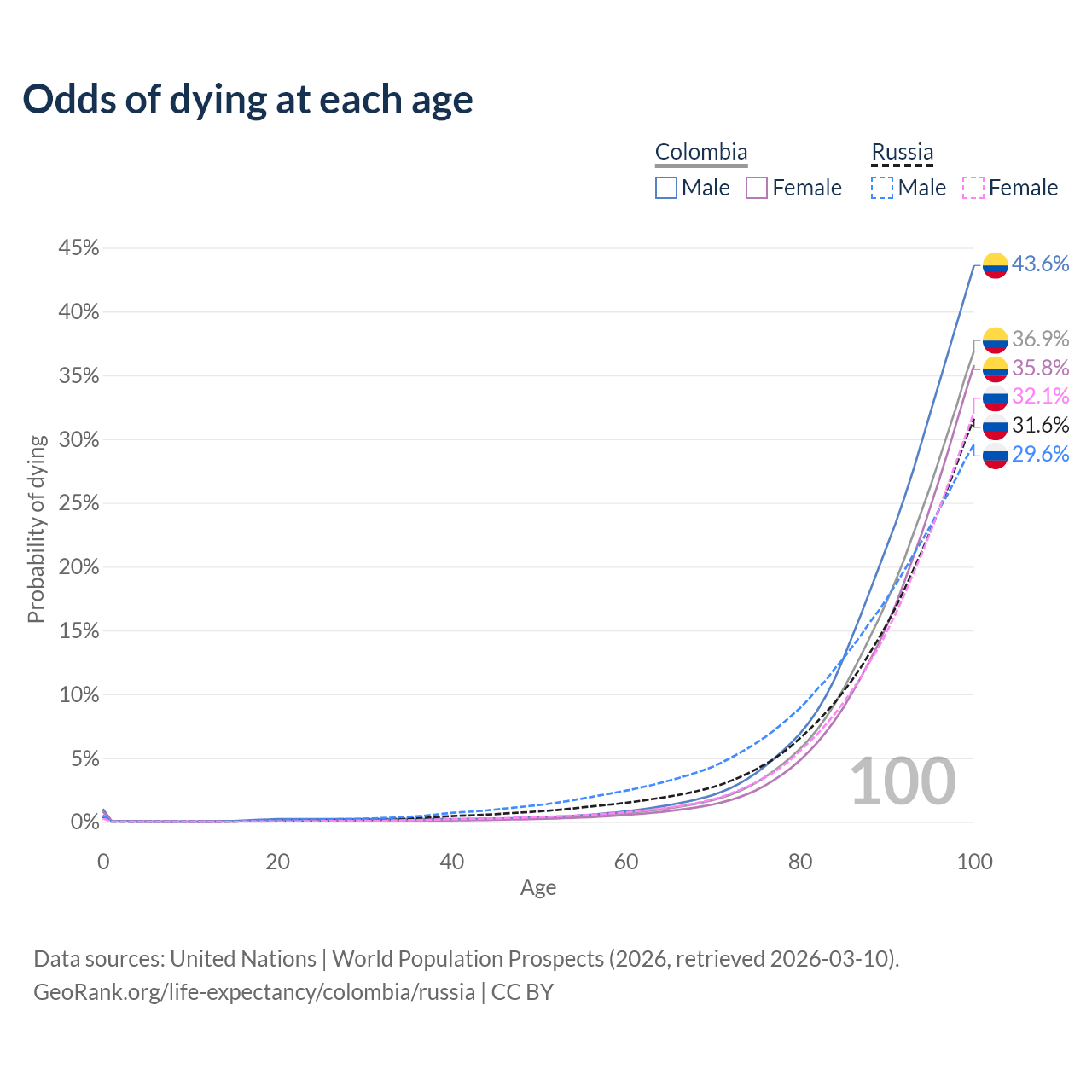 This life expectancy calculator shows the odds of living to 100, 95, 90, and below based on current age for both males and females in Colombia and Russia, along with mean and median age of death. The calculations are based on the 2026 life tables (actuarial tables) from the UN World Population Prospects.