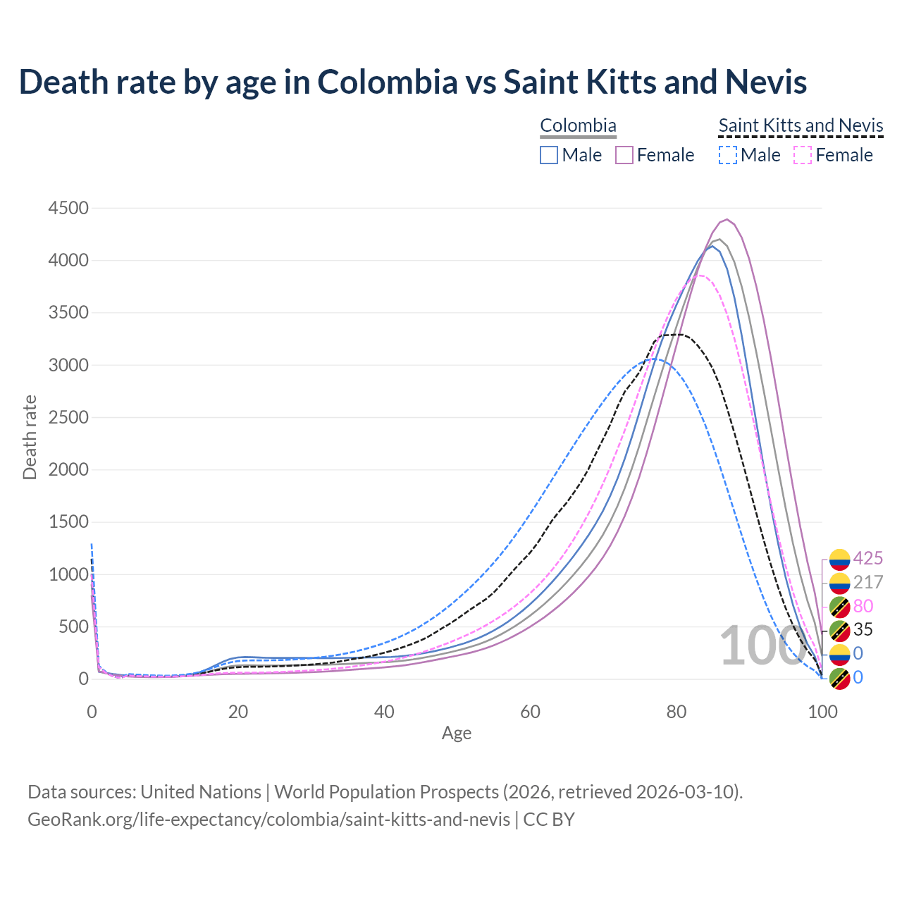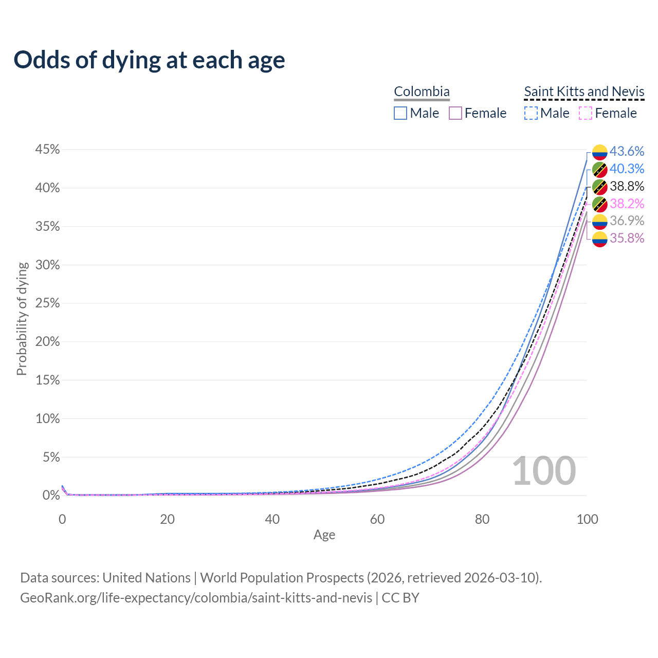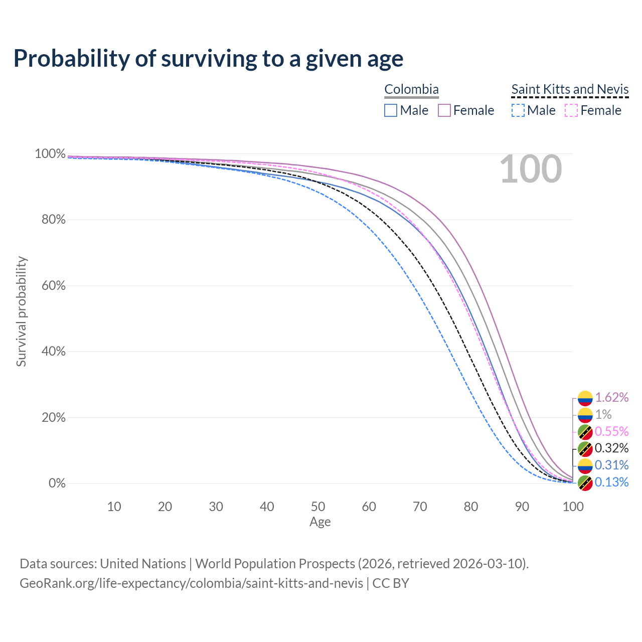 This life expectancy calculator shows the odds of living to 100, 95, 90, and below based on current age for both males and females in Colombia and Saint Kitts and Nevis, along with mean and median age of death. The calculations are based on the 2026 life tables (actuarial tables) from the UN World Population Prospects.