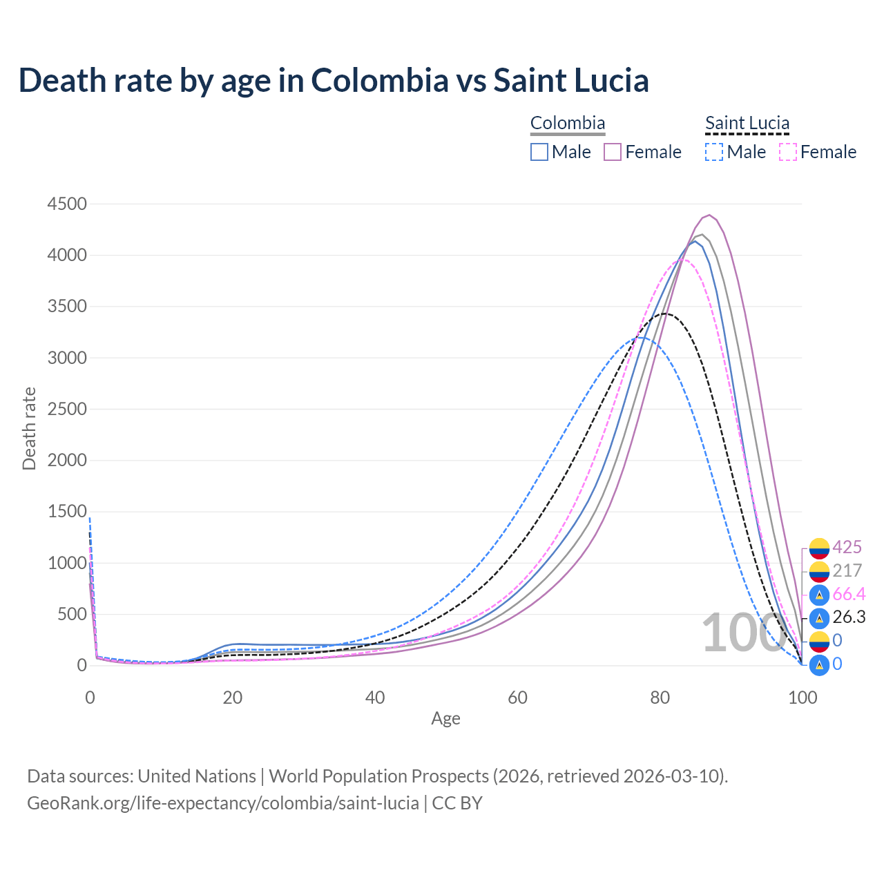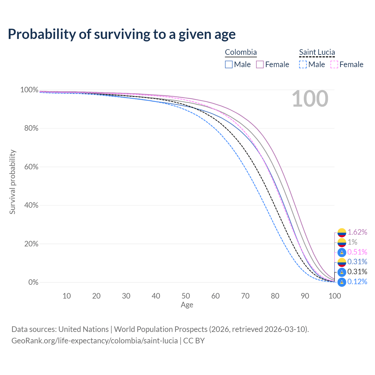 This life expectancy calculator shows the odds of living to 100, 95, 90, and below based on current age for both males and females in Colombia and Saint Lucia, along with mean and median age of death. The calculations are based on the 2026 life tables (actuarial tables) from the UN World Population Prospects.