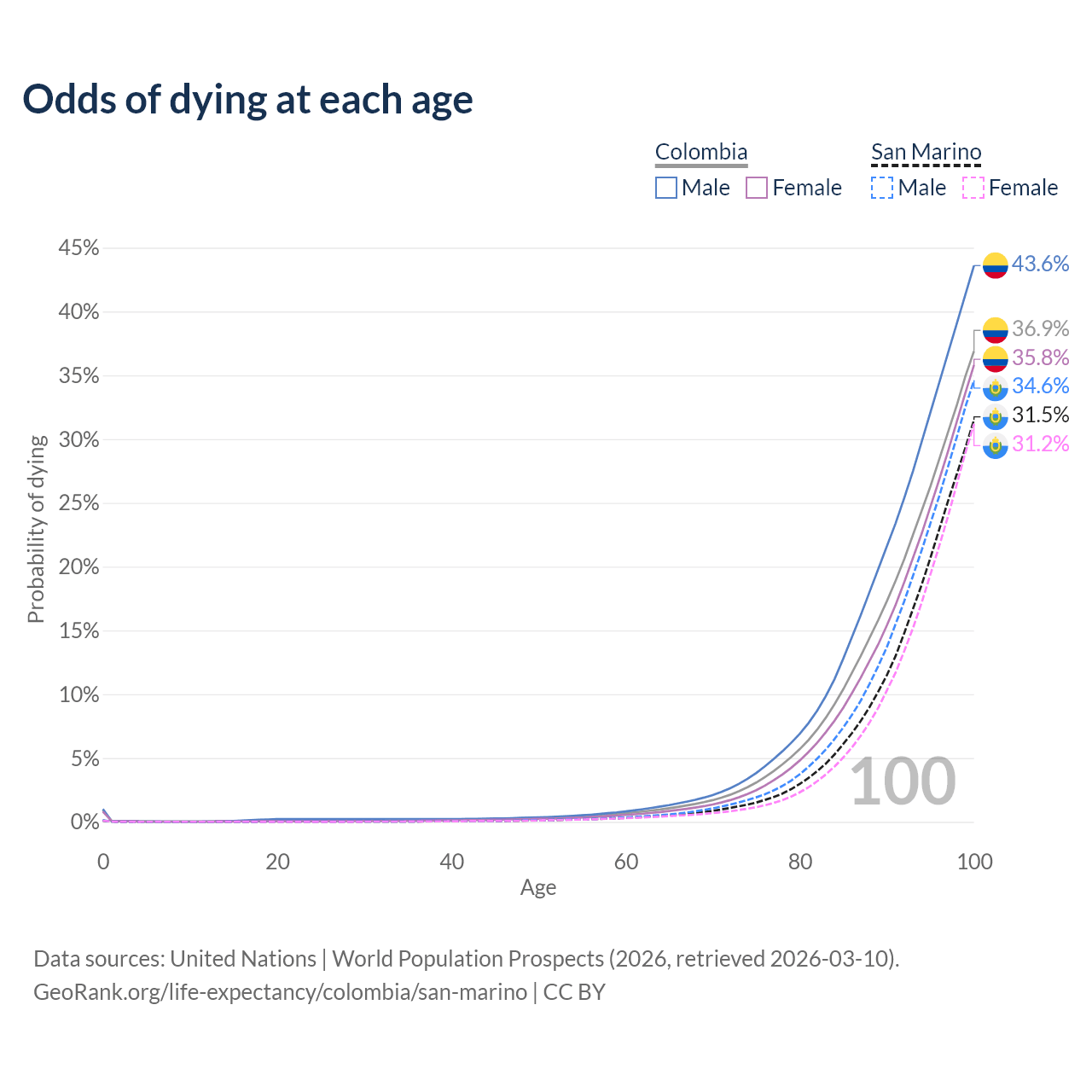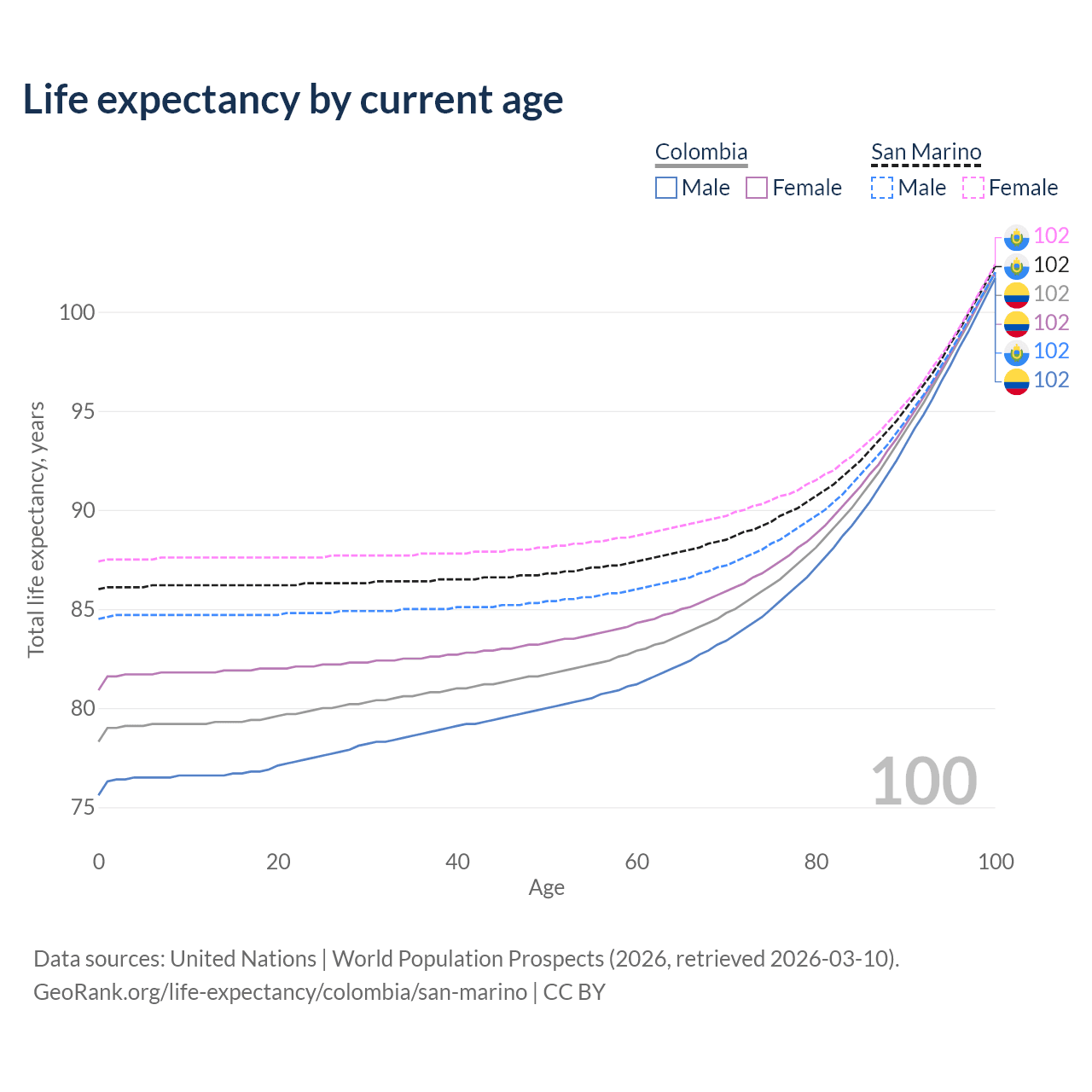 This life expectancy calculator shows the odds of living to 100, 95, 90, and below based on current age for both males and females in Colombia and San Marino, along with mean and median age of death. The calculations are based on the 2026 life tables (actuarial tables) from the UN World Population Prospects.