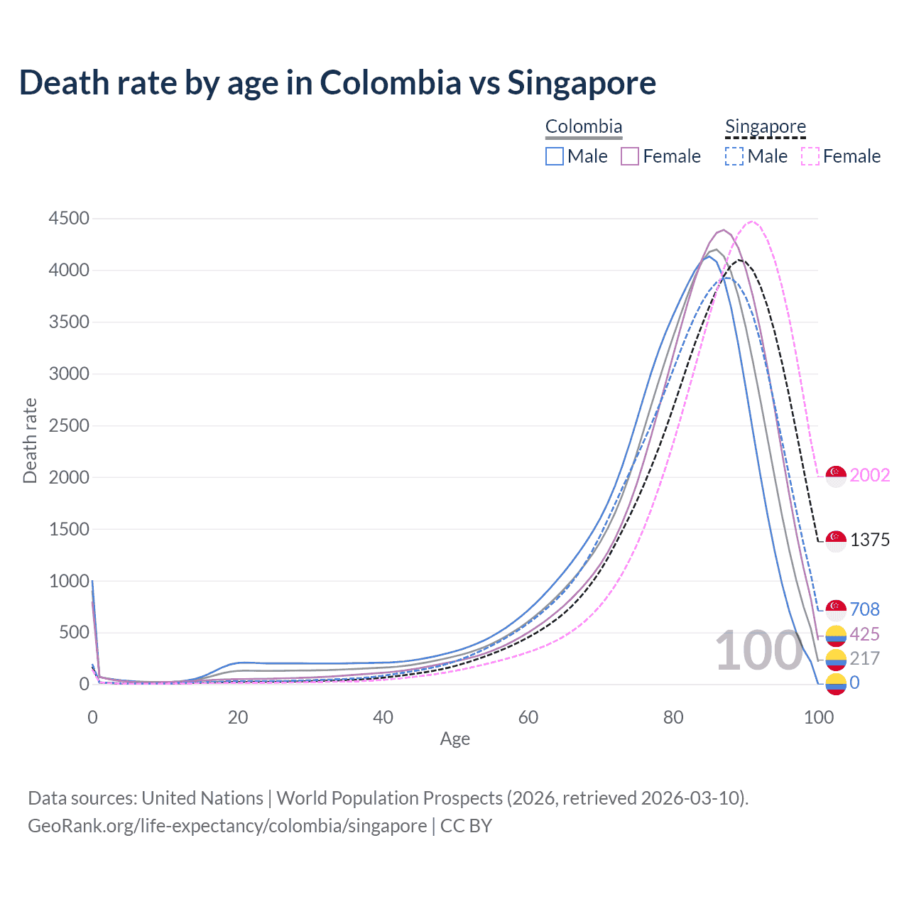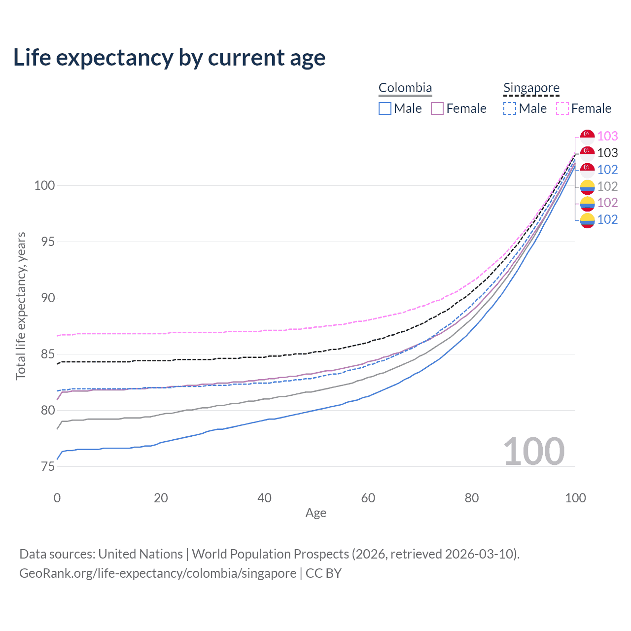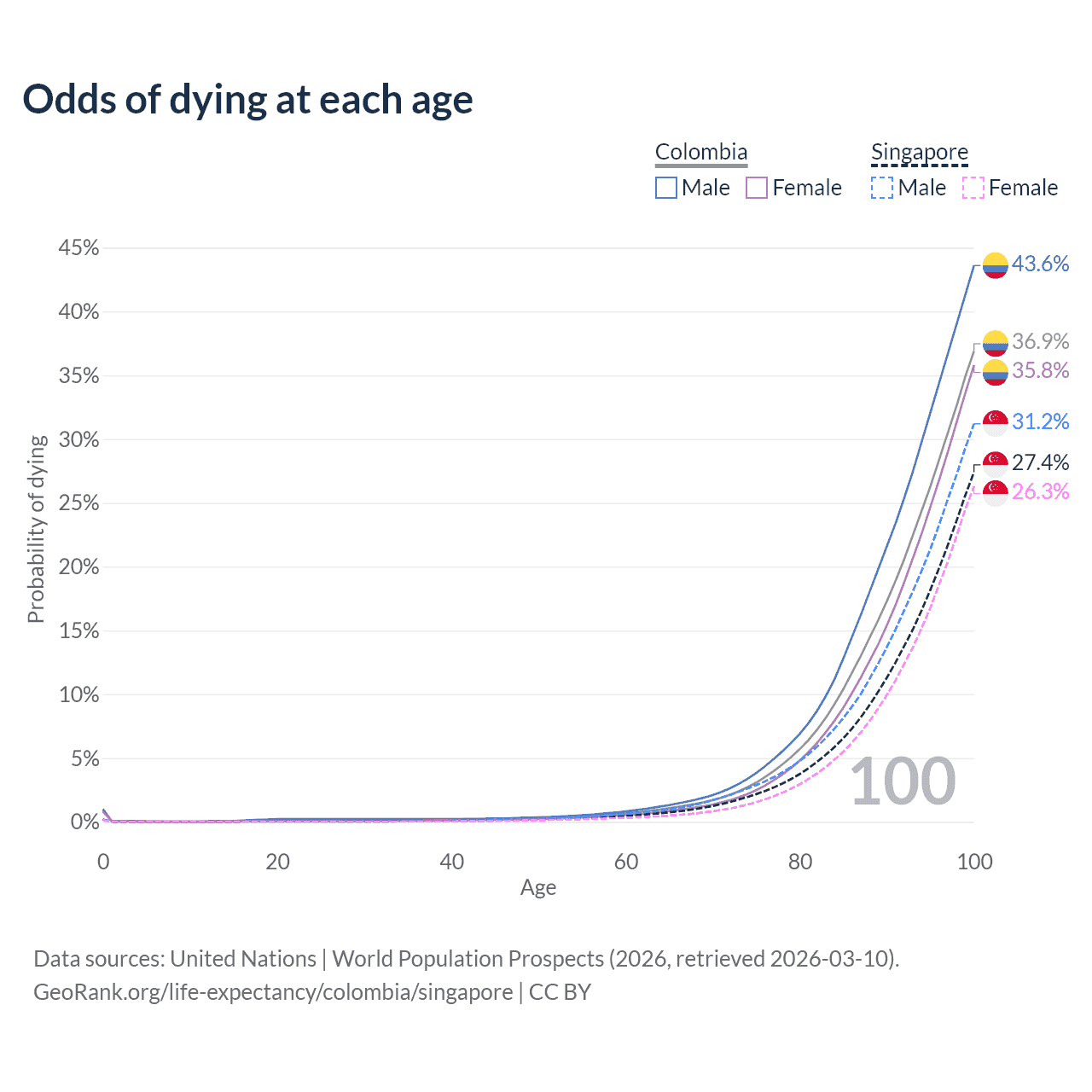 This life expectancy calculator shows the odds of living to 100, 95, 90, and below based on current age for both males and females in Colombia and Singapore, along with mean and median age of death. The calculations are based on the 2026 life tables (actuarial tables) from the UN World Population Prospects.