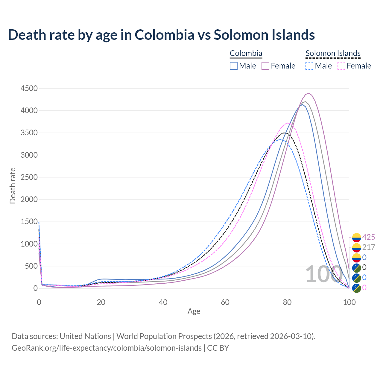 In Colombia, the most common age of death is 86, compared to 79 in the Solomon Islands. The median age of death is 82.5 in Colombia and 74.9 in the Solomon Islands, meaning only half of each cohort is expected to live past that age.
