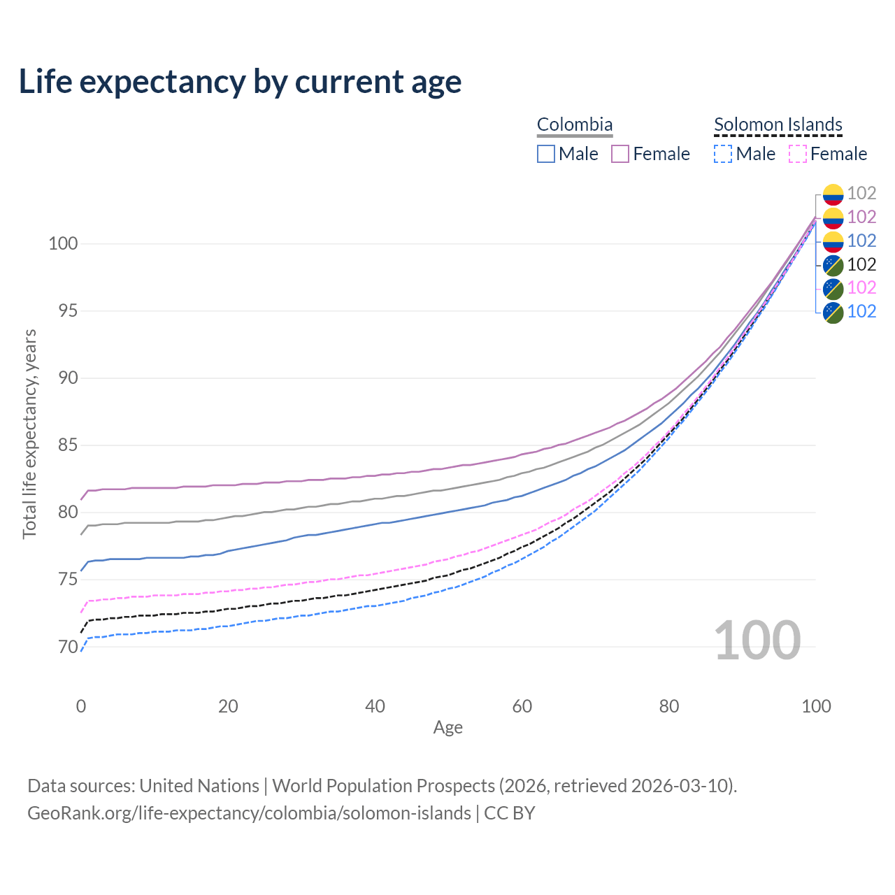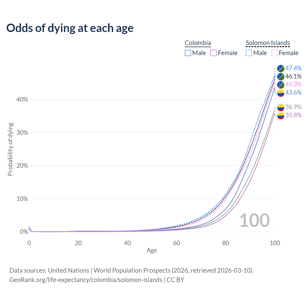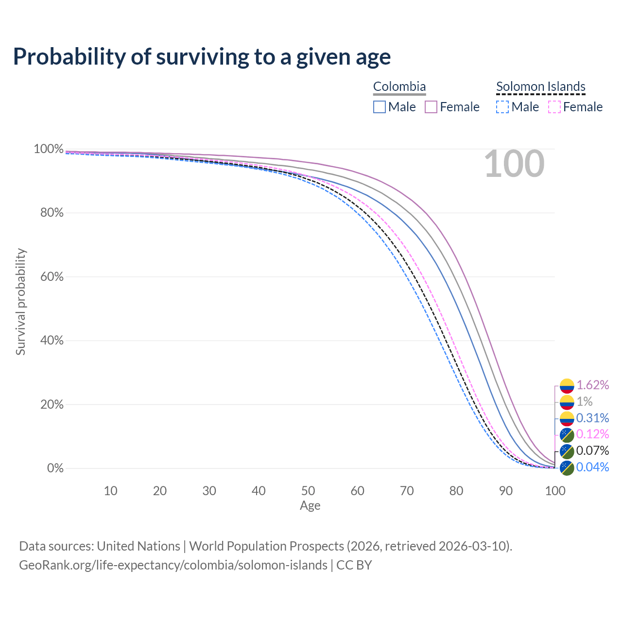 This life expectancy calculator shows the odds of living to 100, 95, 90, and below based on current age for both males and females in Colombia and the Solomon Islands, along with mean and median age of death. The calculations are based on the 2026 life tables (actuarial tables) from the UN World Population Prospects.