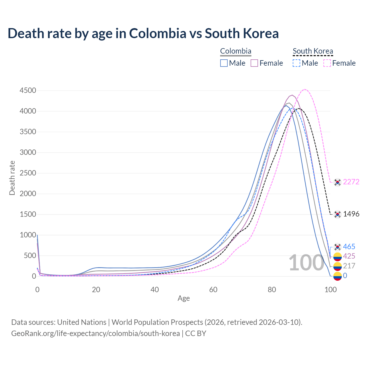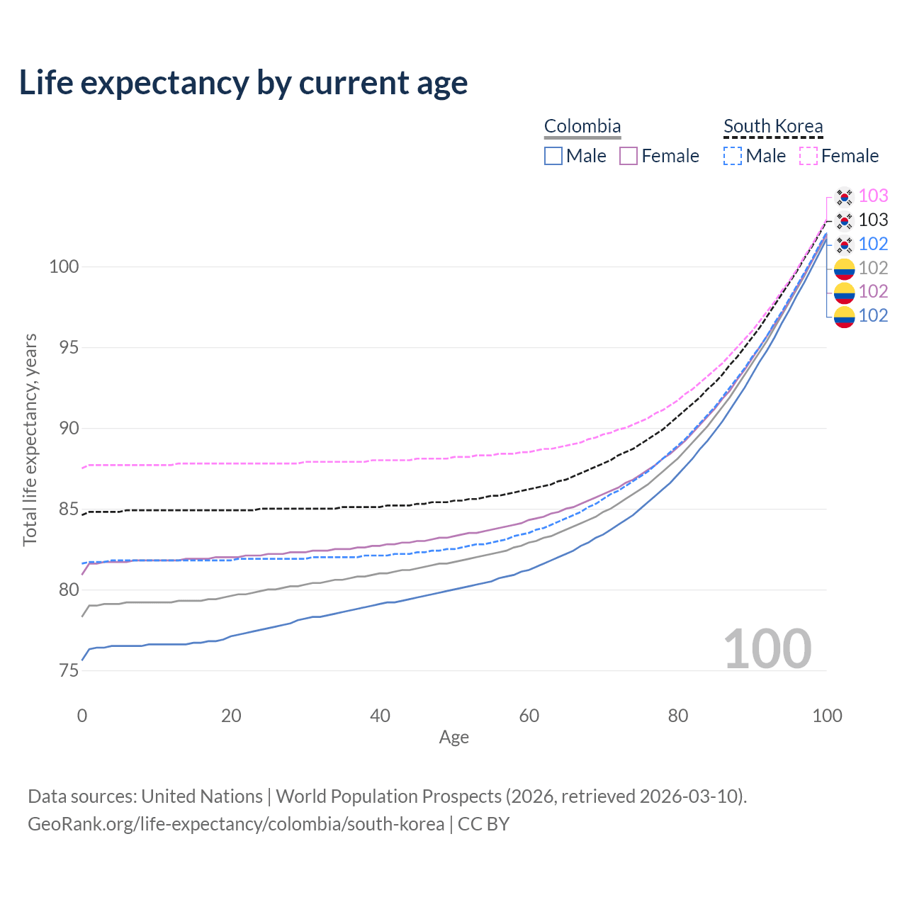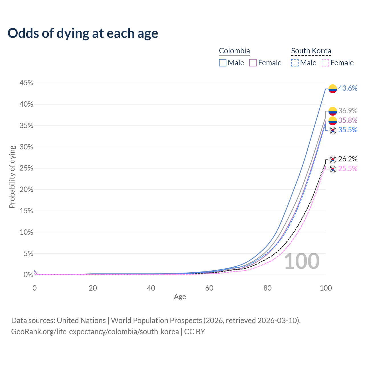 This life expectancy calculator shows the odds of living to 100, 95, 90, and below based on current age for both males and females in Colombia and South Korea, along with mean and median age of death. The calculations are based on the 2026 life tables (actuarial tables) from the UN World Population Prospects.