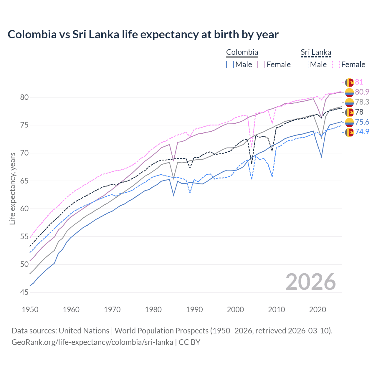 The average life expectancy at birth is 78.3 years in Colombia vs 78 in Sri Lanka. Colombia is ranked 60/197 by life expectancy, and Sri Lanka is 64/197. In Colombia, the life expectancy is 75.6 years for males and 80.9 years for females. In Sri Lanka, it's 74.9 years for males and 81 years for females.