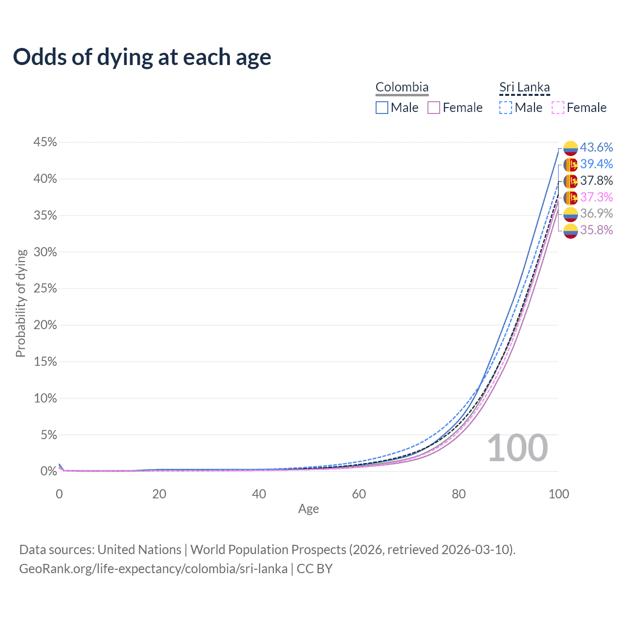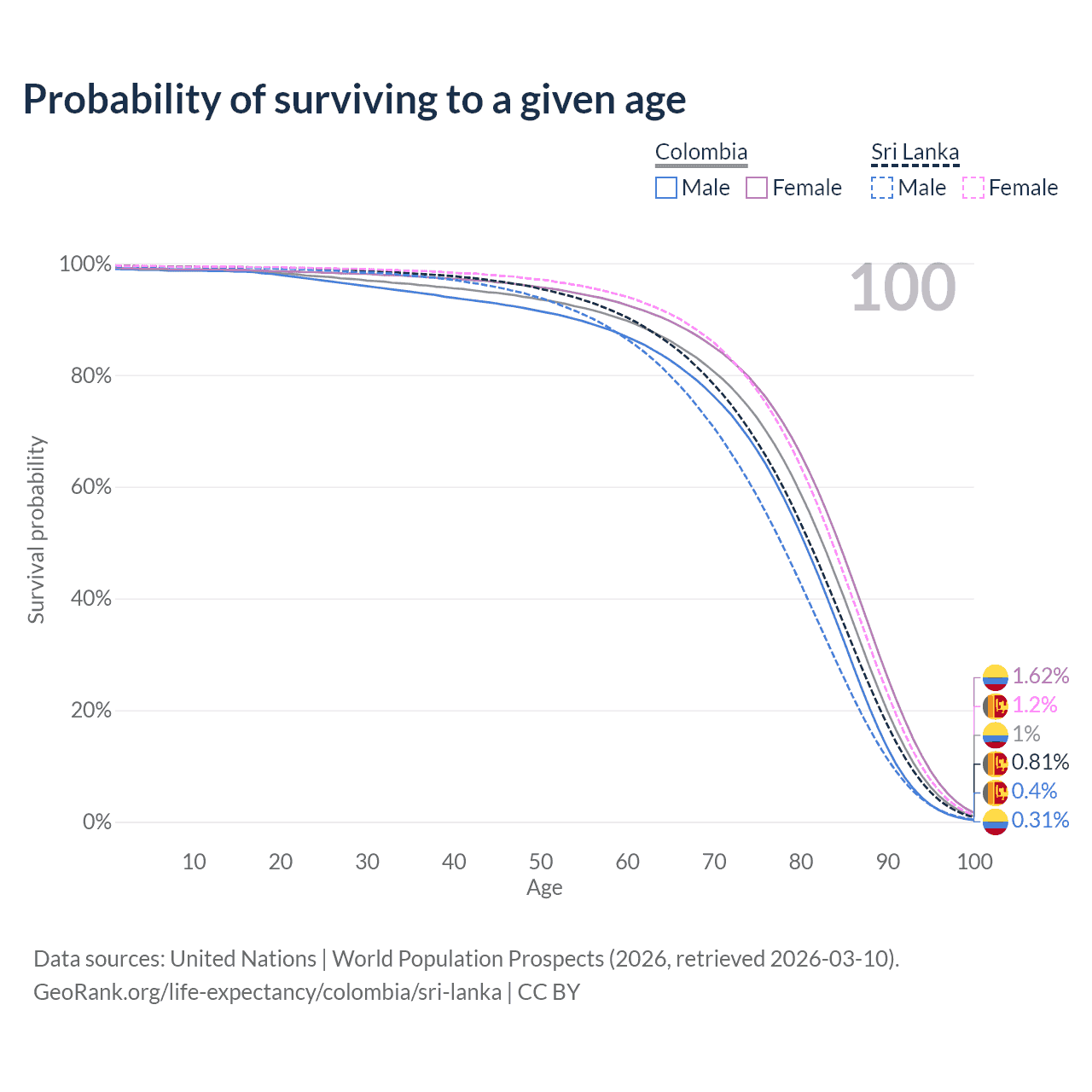 This life expectancy calculator shows the odds of living to 100, 95, 90, and below based on current age for both males and females in Colombia and Sri Lanka, along with mean and median age of death. The calculations are based on the 2026 life tables (actuarial tables) from the UN World Population Prospects.