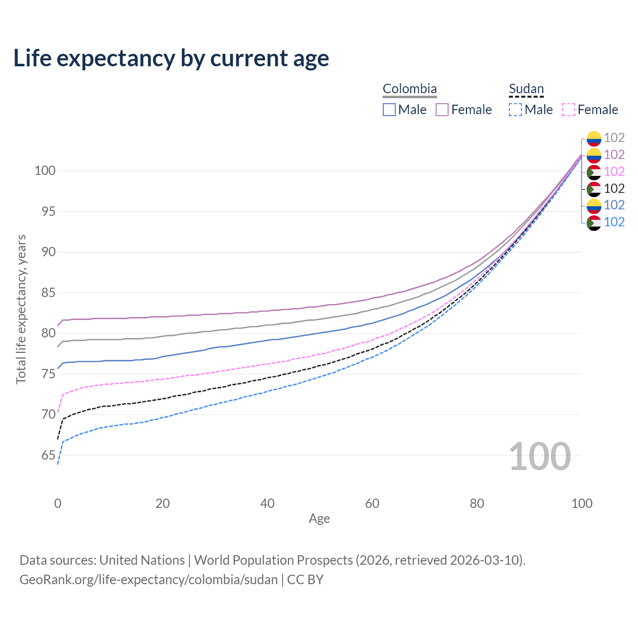This life expectancy calculator shows the odds of living to 100, 95, 90, and below based on current age for both males and females in Colombia and Sudan, along with mean and median age of death. The calculations are based on the 2026 life tables (actuarial tables) from the UN World Population Prospects.