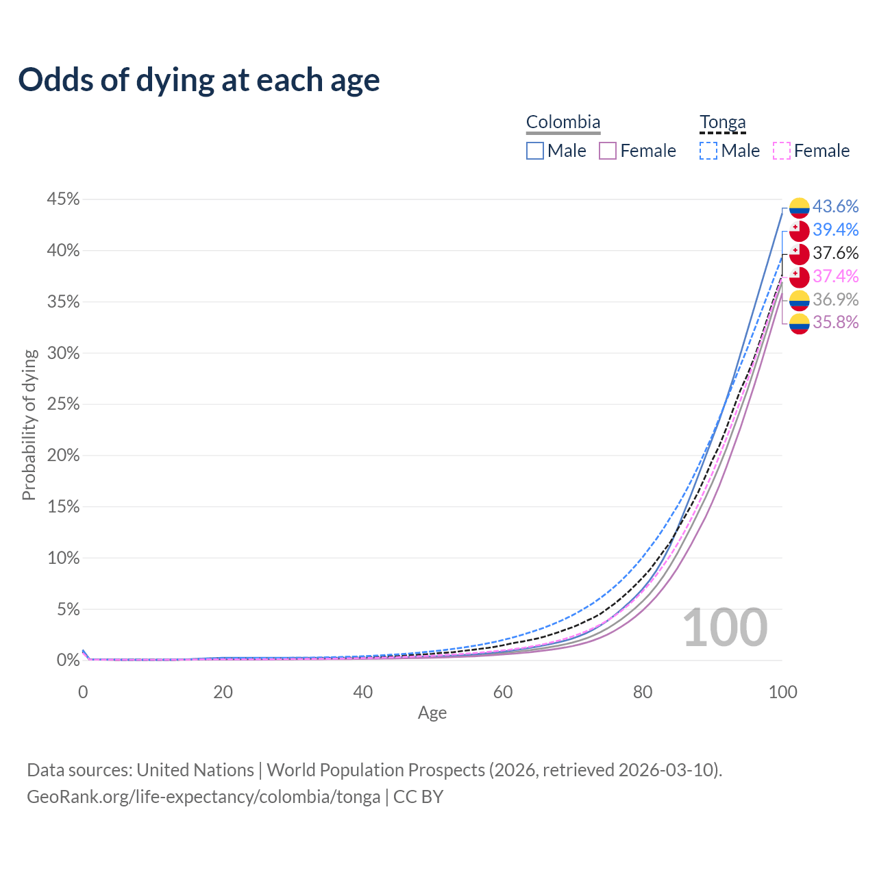 This life expectancy calculator shows the odds of living to 100, 95, 90, and below based on current age for both males and females in Colombia and Tonga, along with mean and median age of death. The calculations are based on the 2026 life tables (actuarial tables) from the UN World Population Prospects.