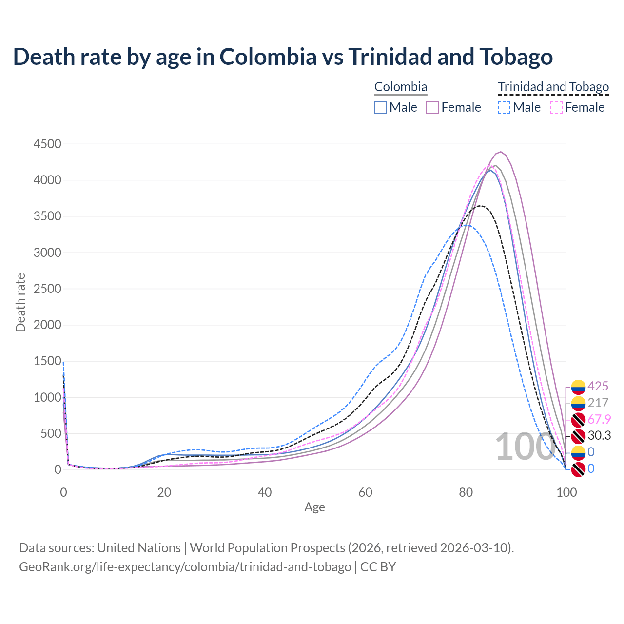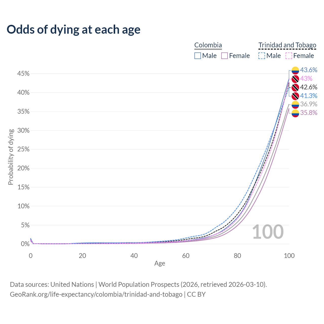 This life expectancy calculator shows the odds of living to 100, 95, 90, and below based on current age for both males and females in Colombia and Trinidad and Tobago, along with mean and median age of death. The calculations are based on the 2026 life tables (actuarial tables) from the UN World Population Prospects.