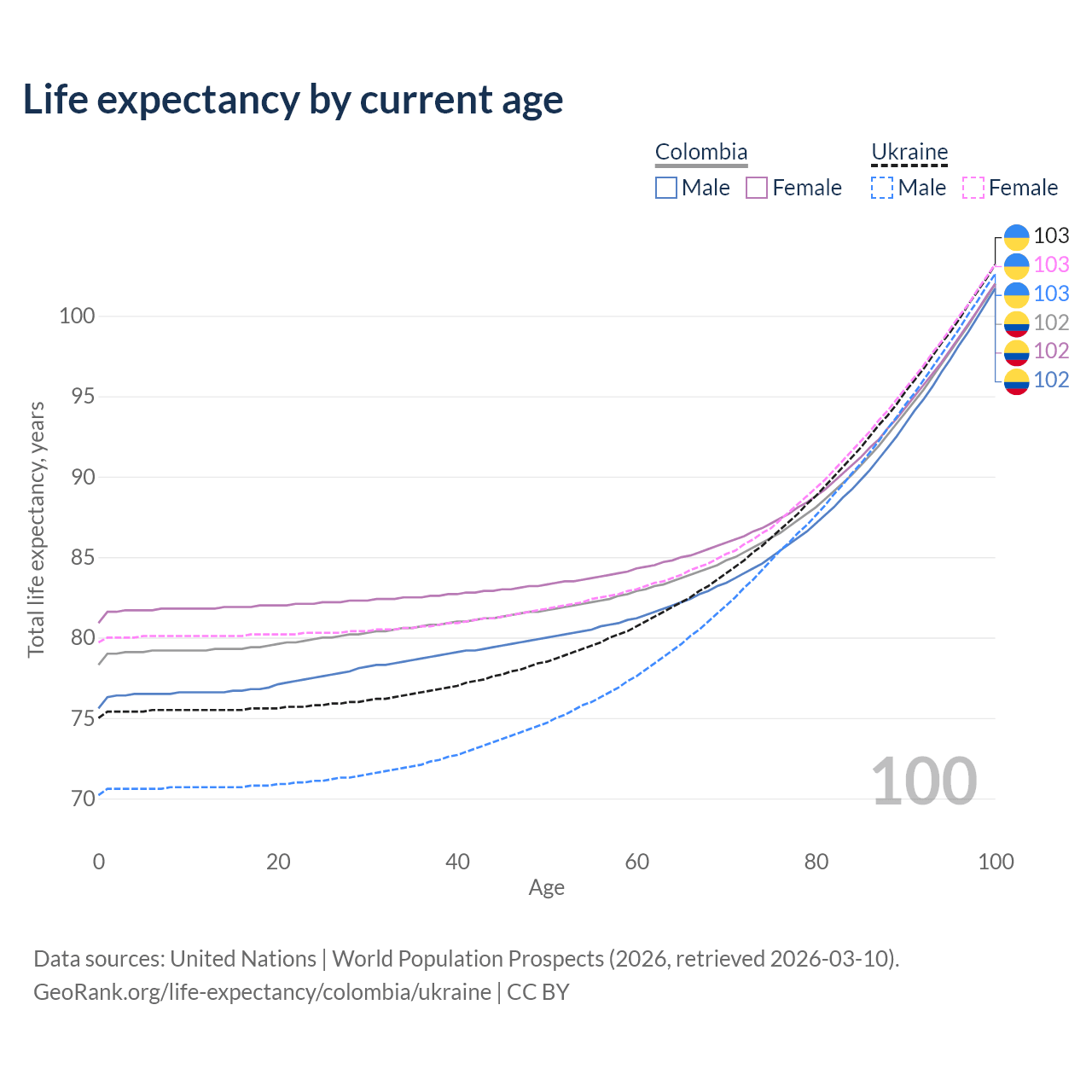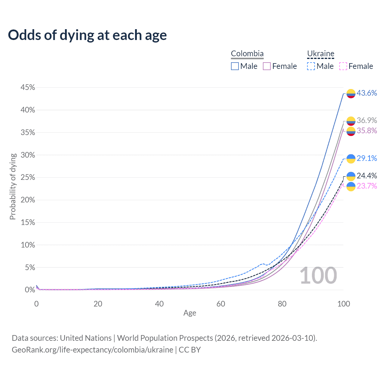 This life expectancy calculator shows the odds of living to 100, 95, 90, and below based on current age for both males and females in Colombia and Ukraine, along with mean and median age of death. The calculations are based on the 2026 life tables (actuarial tables) from the UN World Population Prospects.
