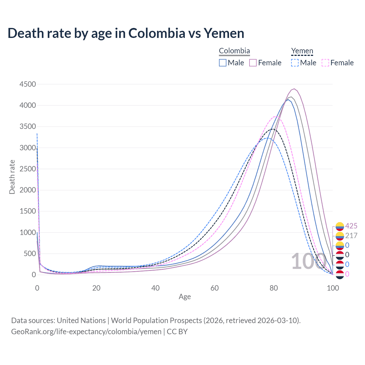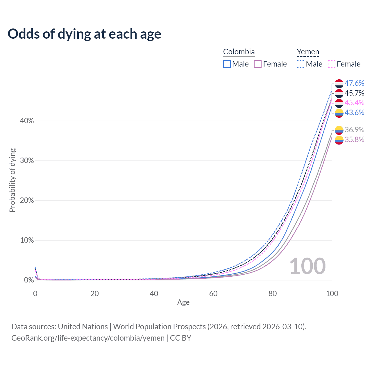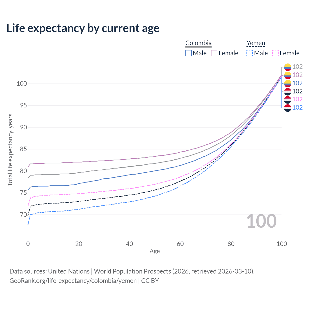 This life expectancy calculator shows the odds of living to 100, 95, 90, and below based on current age for both males and females in Colombia and Yemen, along with mean and median age of death. The calculations are based on the 2026 life tables (actuarial tables) from the UN World Population Prospects.