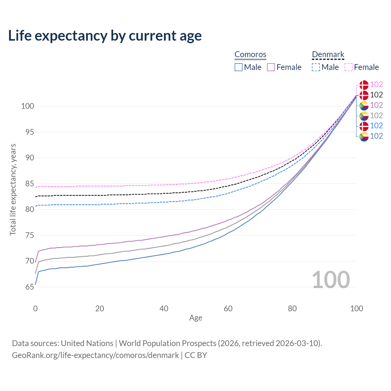 This life expectancy calculator shows the odds of living to 100, 95, 90, and below based on current age for both males and females in Comoros and Denmark, along with mean and median age of death. The calculations are based on the 2026 life tables (actuarial tables) from the UN World Population Prospects.