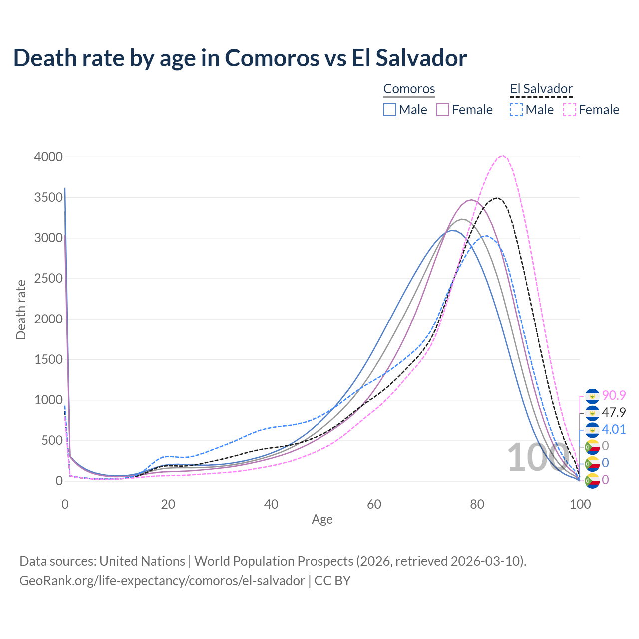 In Comoros, the most common age of death is 0, compared to 84 in El Salvador. The median age of death is 72.9 in Comoros and 78.1 in El Salvador, meaning only half of each cohort is expected to live past that age.
