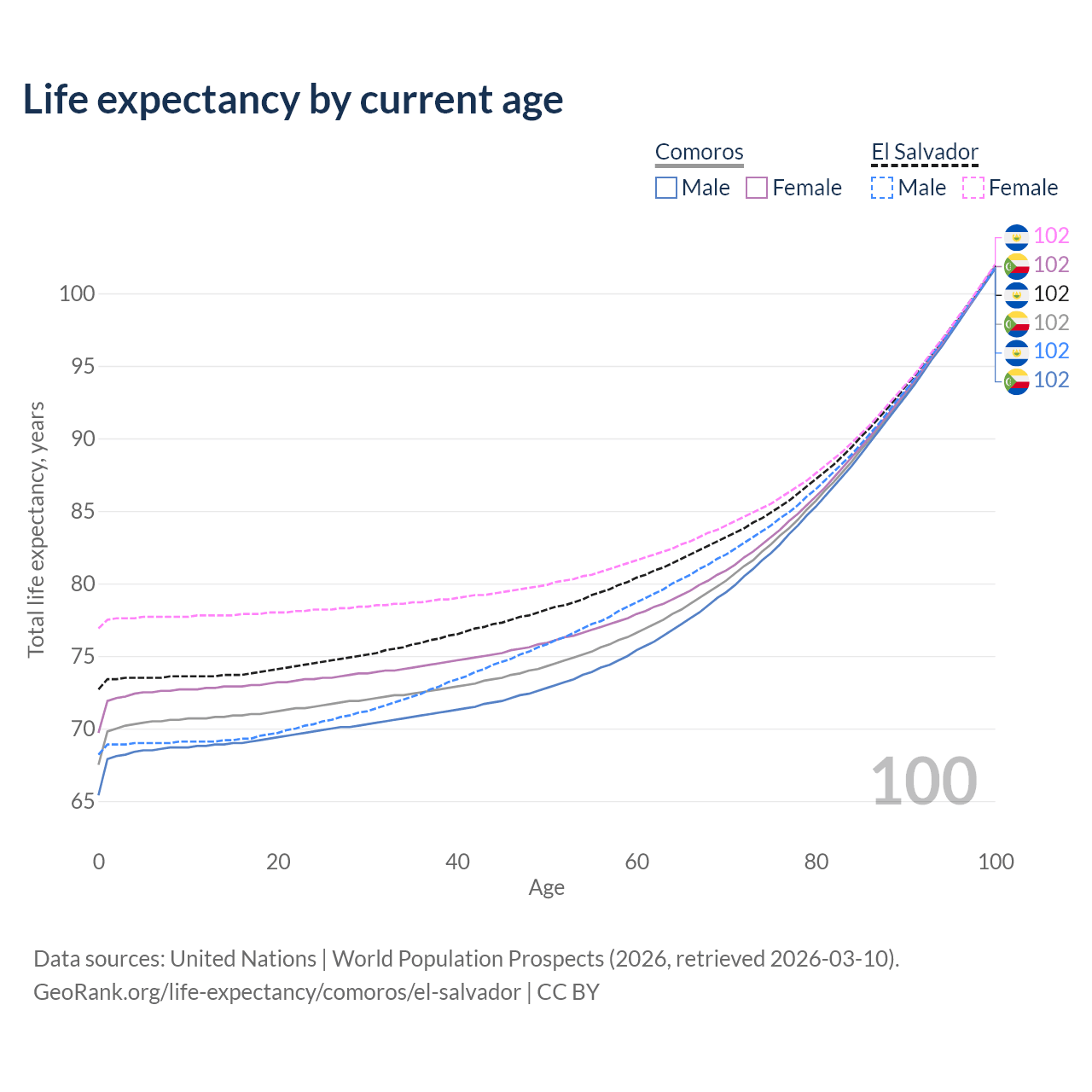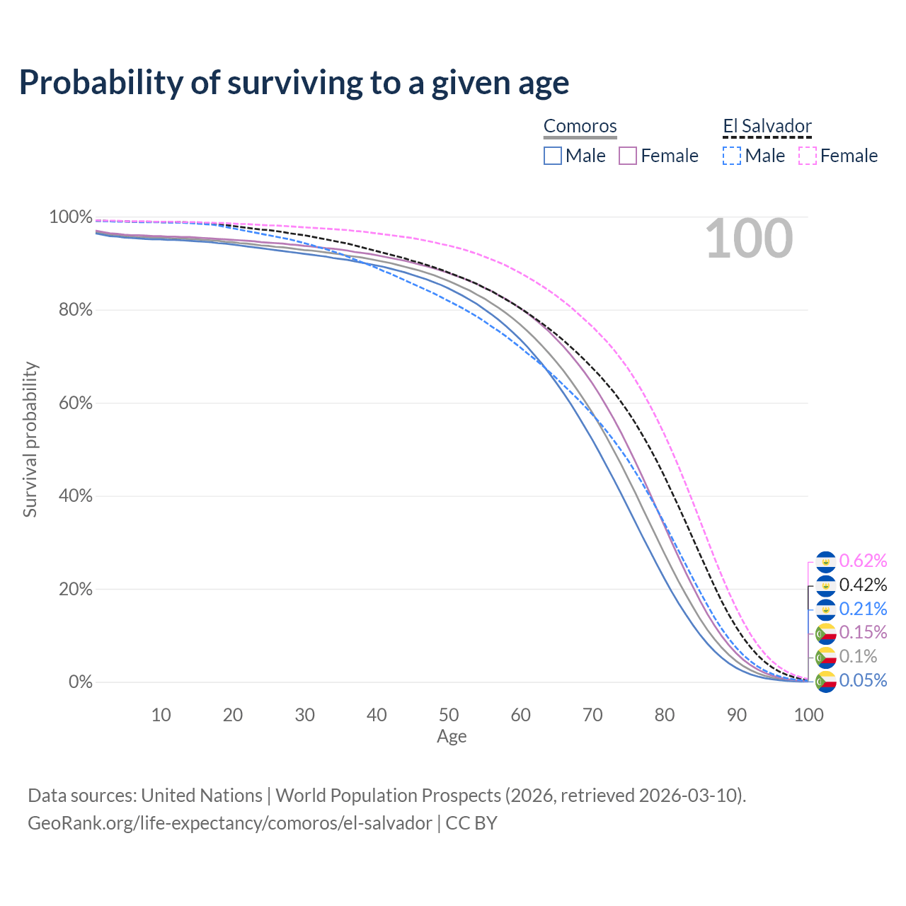 This life expectancy calculator shows the odds of living to 100, 95, 90, and below based on current age for both males and females in Comoros and El Salvador, along with mean and median age of death. The calculations are based on the 2026 life tables (actuarial tables) from the UN World Population Prospects.
