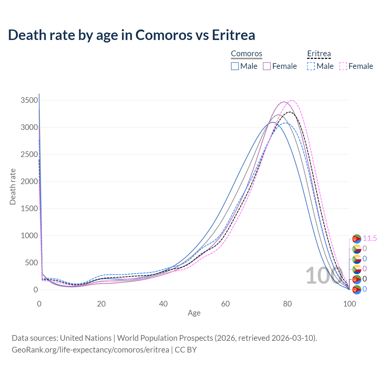 In Comoros, the most common age of death is 0, compared to 81 in Eritrea. The median age of death is 72.9 in Comoros and 75.5 in Eritrea, meaning only half of each cohort is expected to live past that age.