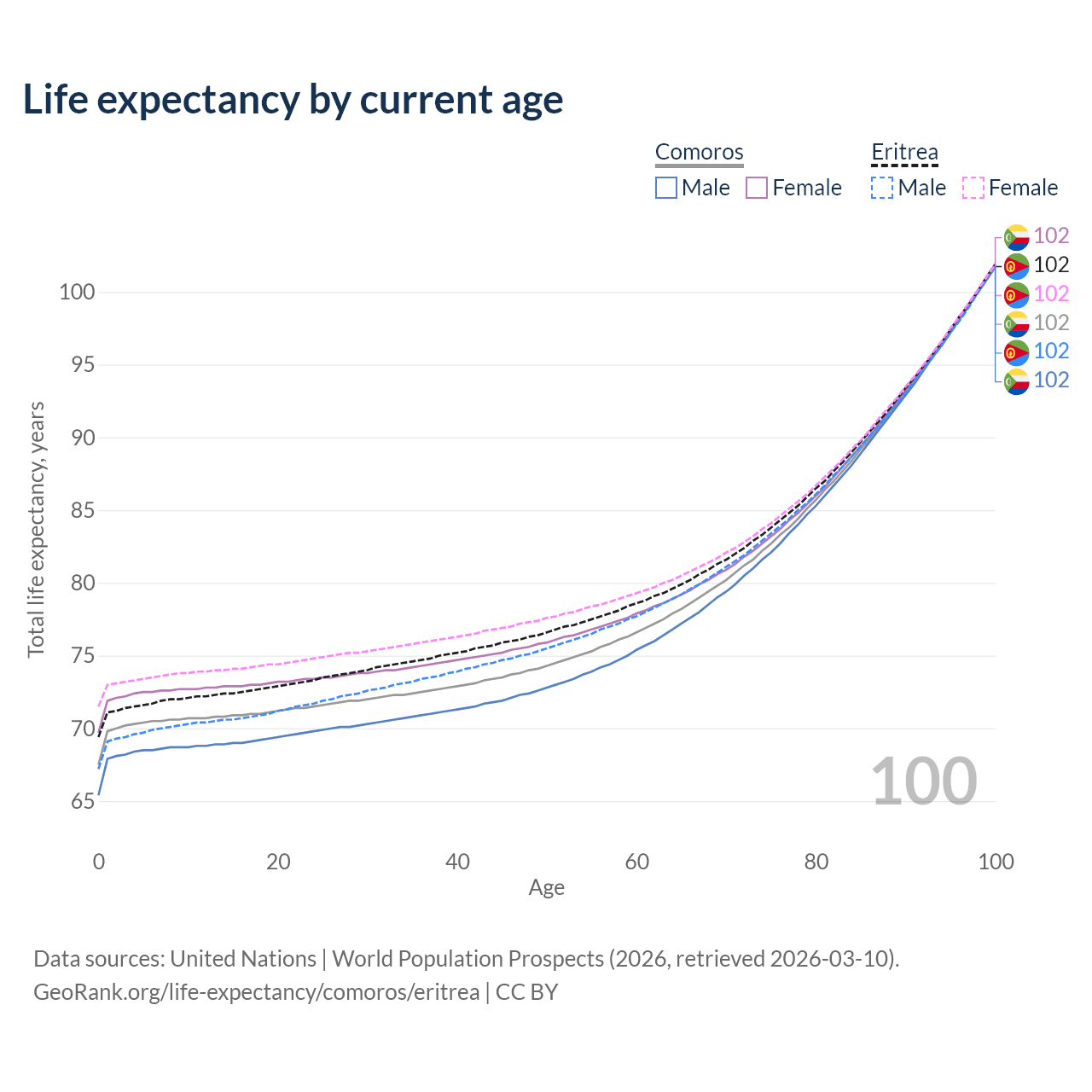 This life expectancy calculator shows the odds of living to 100, 95, 90, and below based on current age for both males and females in Comoros and Eritrea, along with mean and median age of death. The calculations are based on the 2026 life tables (actuarial tables) from the UN World Population Prospects.