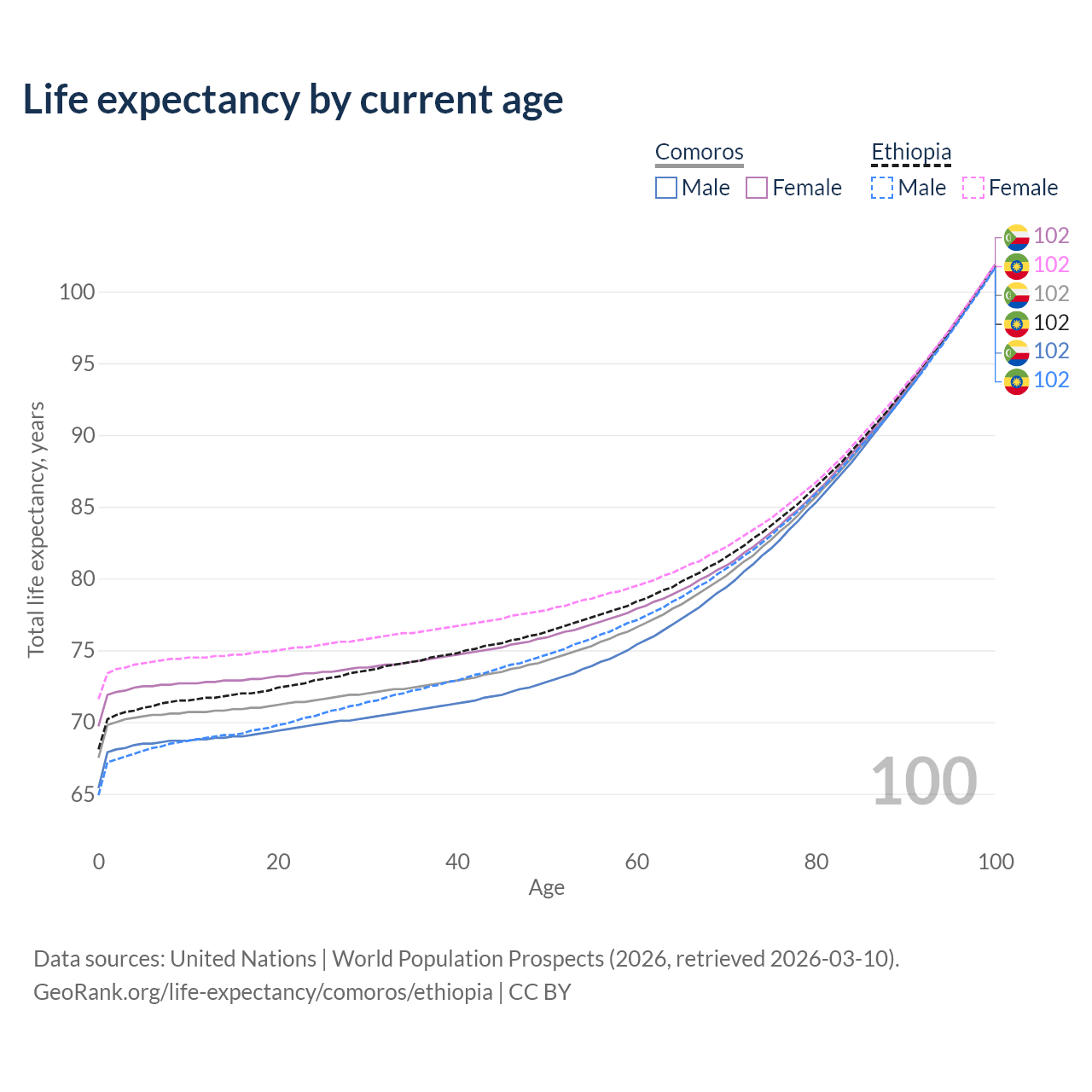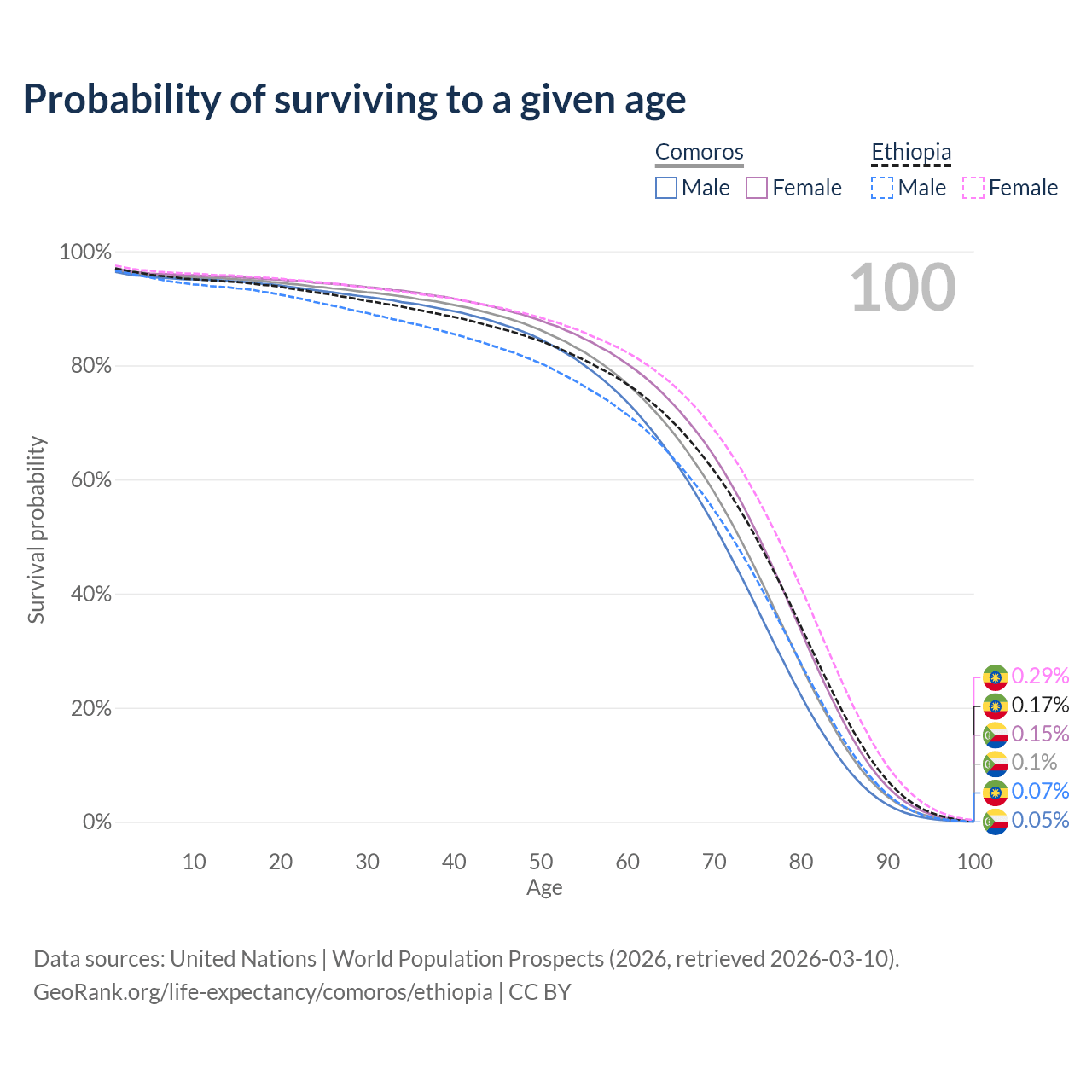 This life expectancy calculator shows the odds of living to 100, 95, 90, and below based on current age for both males and females in Comoros and Ethiopia, along with mean and median age of death. The calculations are based on the 2026 life tables (actuarial tables) from the UN World Population Prospects.