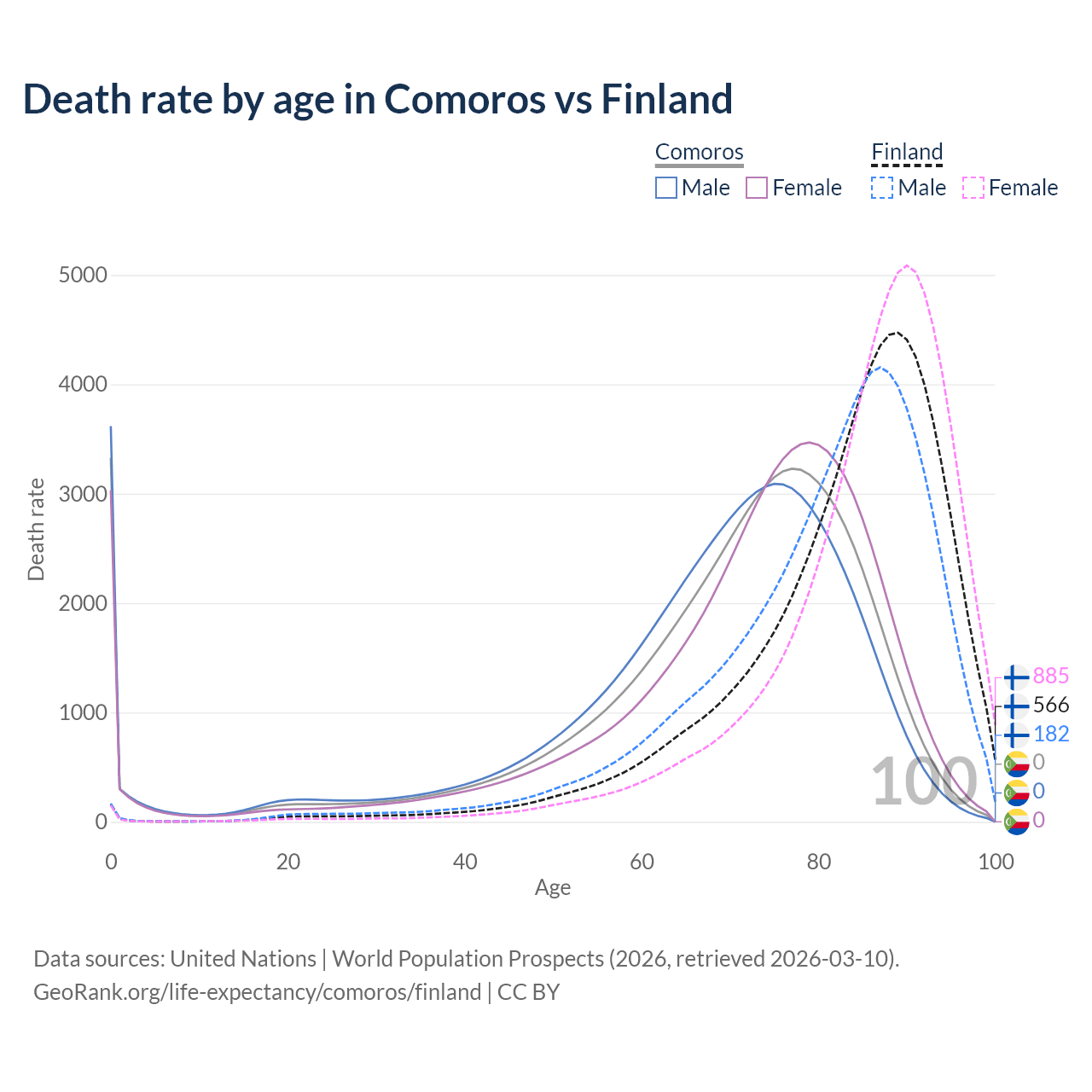 In Comoros, the most common age of death is 0, compared to 89 in Finland. The median age of death is 72.9 in Comoros and 85.6 in Finland, meaning only half of each cohort is expected to live past that age.