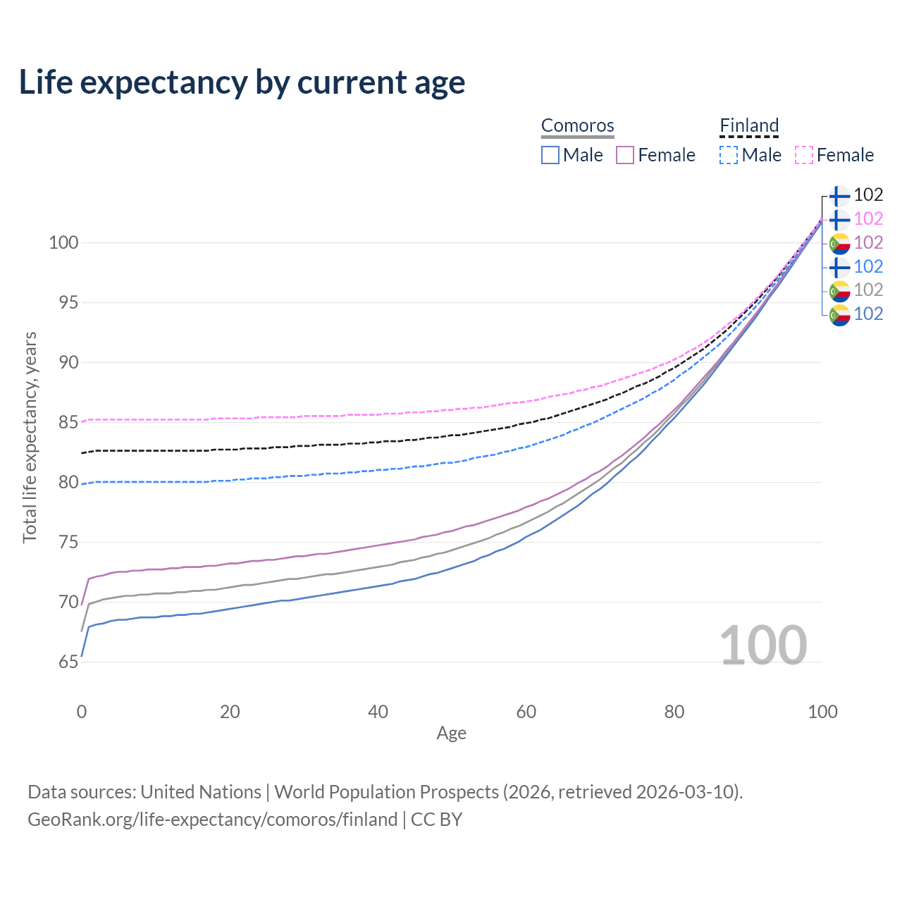 The average life expectancy at birth is 67.5 years in Comoros vs 82.4 in Finland. Comoros is ranked 158/197 by life expectancy, and Finland is 29/197. In Comoros, the life expectancy is 65.4 years for males and 69.7 years for females. In Finland, it's 79.8 years for males and 85 years for females.