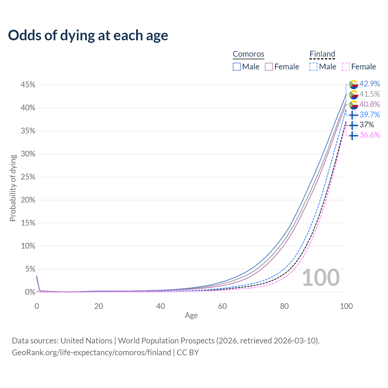 This life expectancy calculator shows the odds of living to 100, 95, 90, and below based on current age for both males and females in Comoros and Finland, along with mean and median age of death. The calculations are based on the 2026 life tables (actuarial tables) from the UN World Population Prospects.