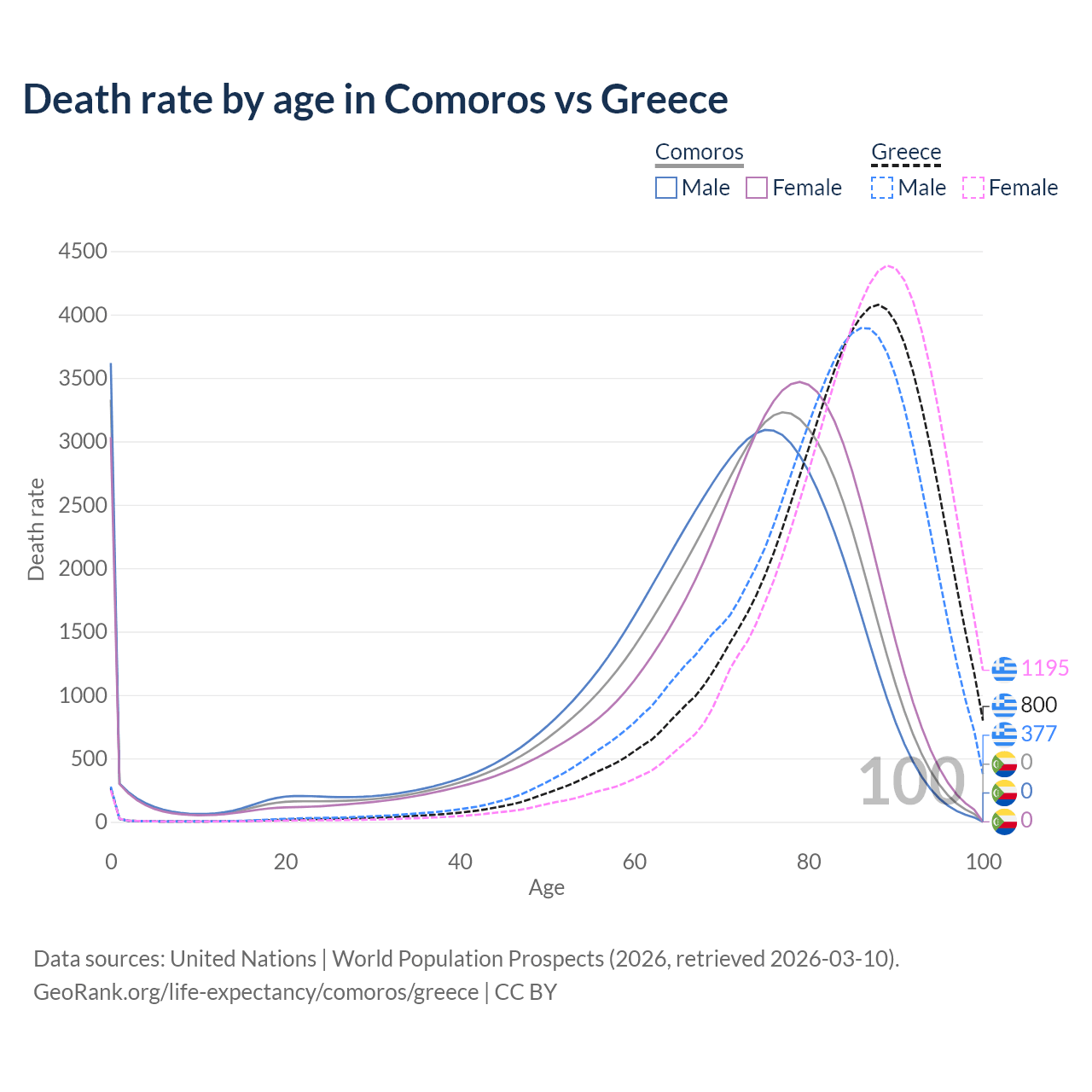 In Comoros, the most common age of death is 0, compared to 88 in Greece. The median age of death is 72.9 in Comoros and 84.9 in Greece, meaning only half of each cohort is expected to live past that age.