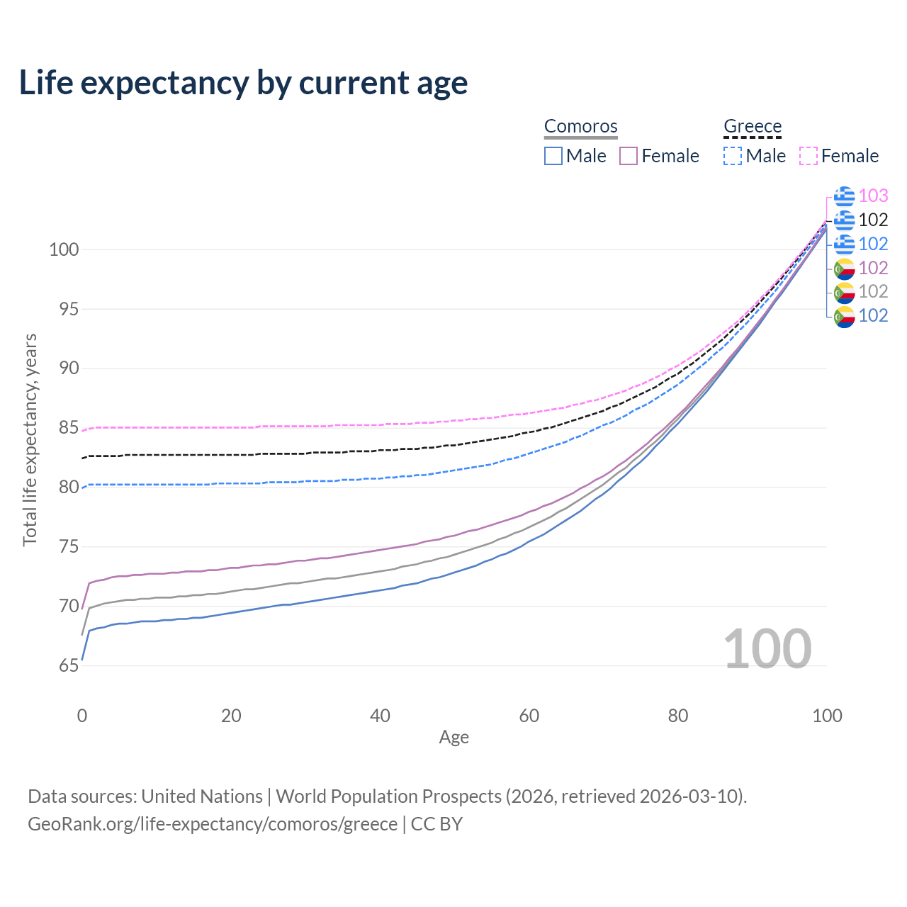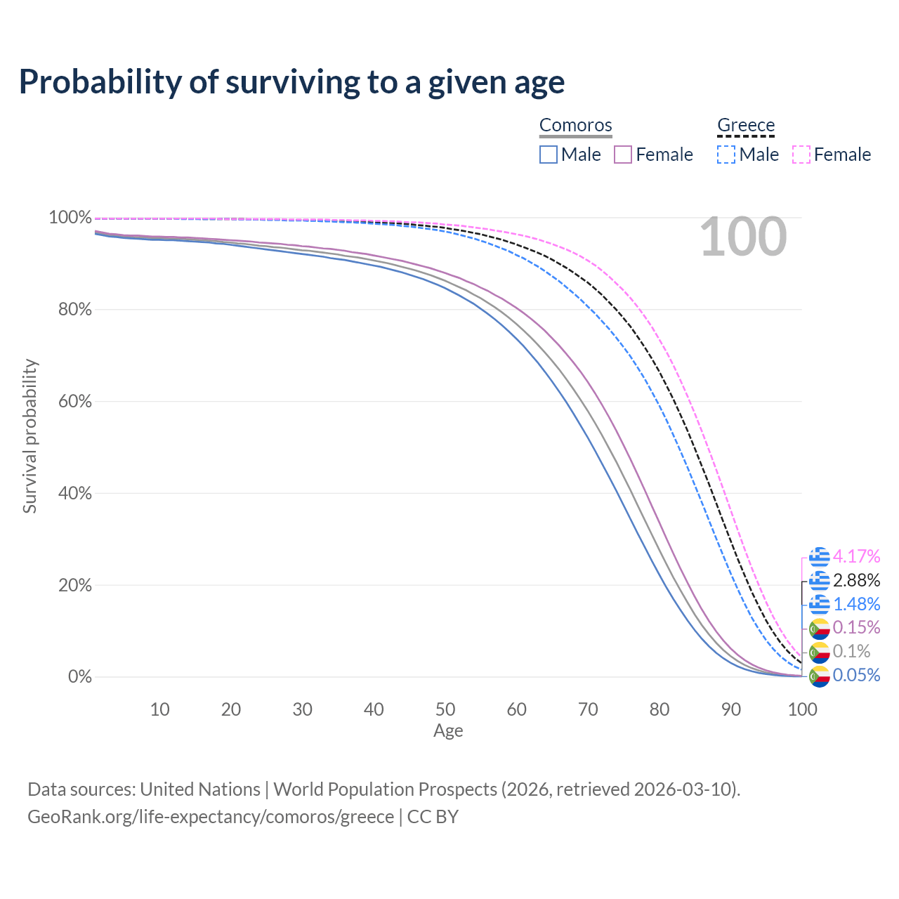 This life expectancy calculator shows the odds of living to 100, 95, 90, and below based on current age for both males and females in Comoros and Greece, along with mean and median age of death. The calculations are based on the 2026 life tables (actuarial tables) from the UN World Population Prospects.