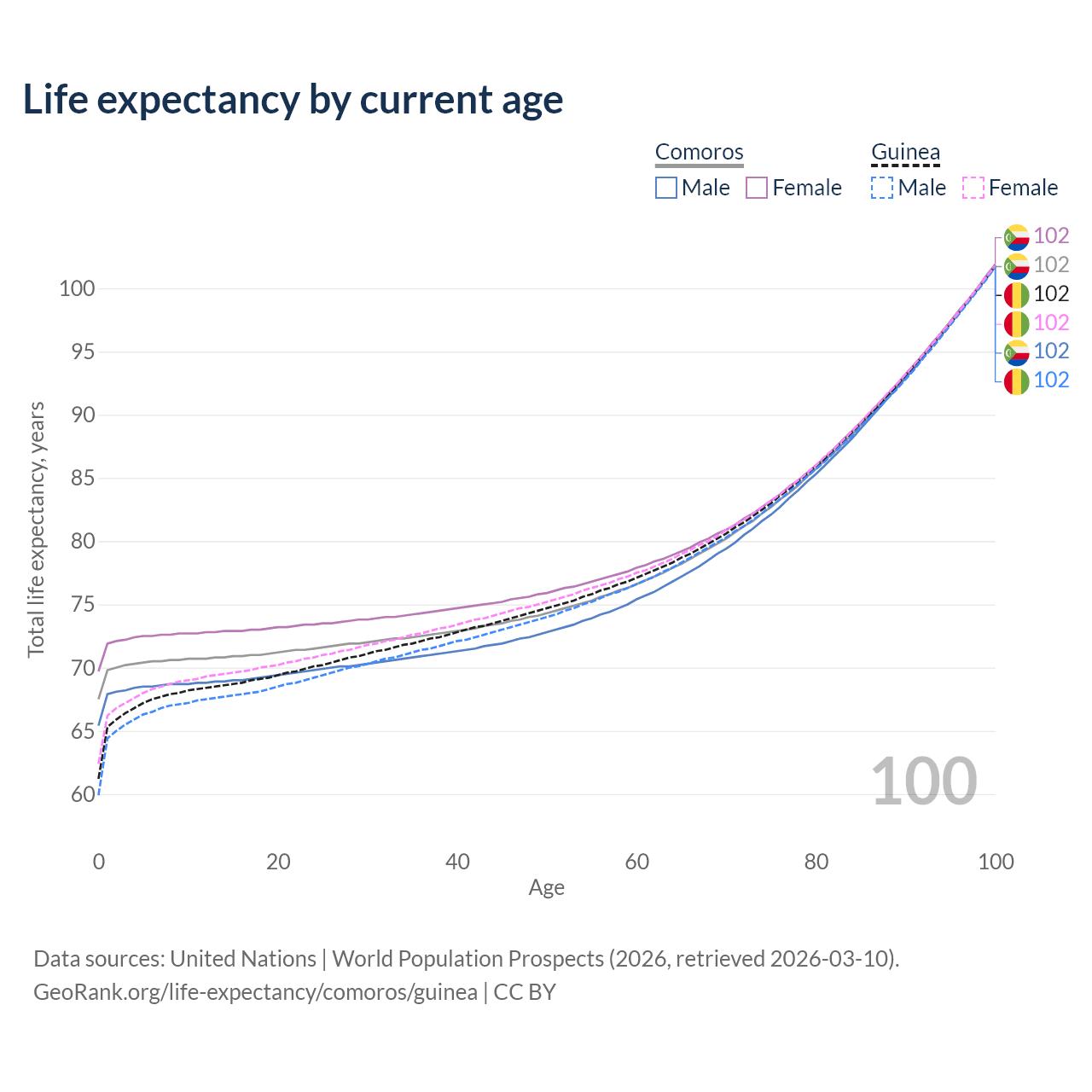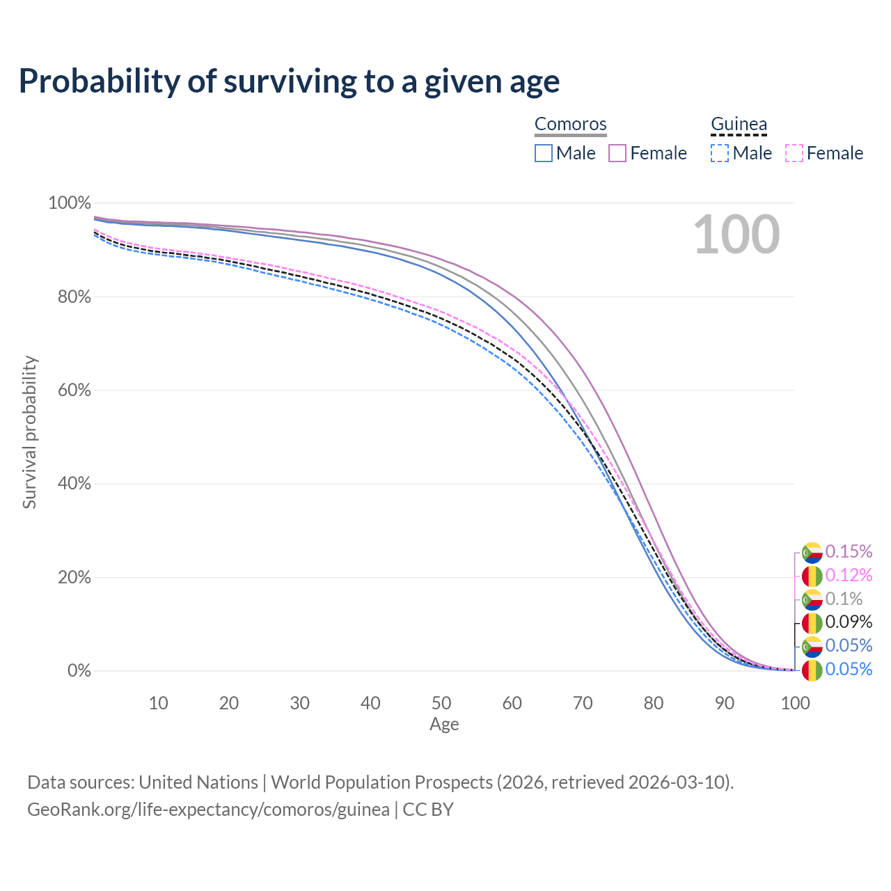 This life expectancy calculator shows the odds of living to 100, 95, 90, and below based on current age for both males and females in Comoros and Guinea, along with mean and median age of death. The calculations are based on the 2026 life tables (actuarial tables) from the UN World Population Prospects.