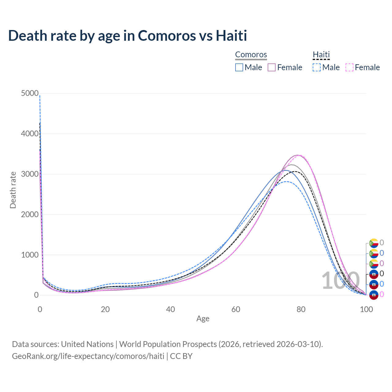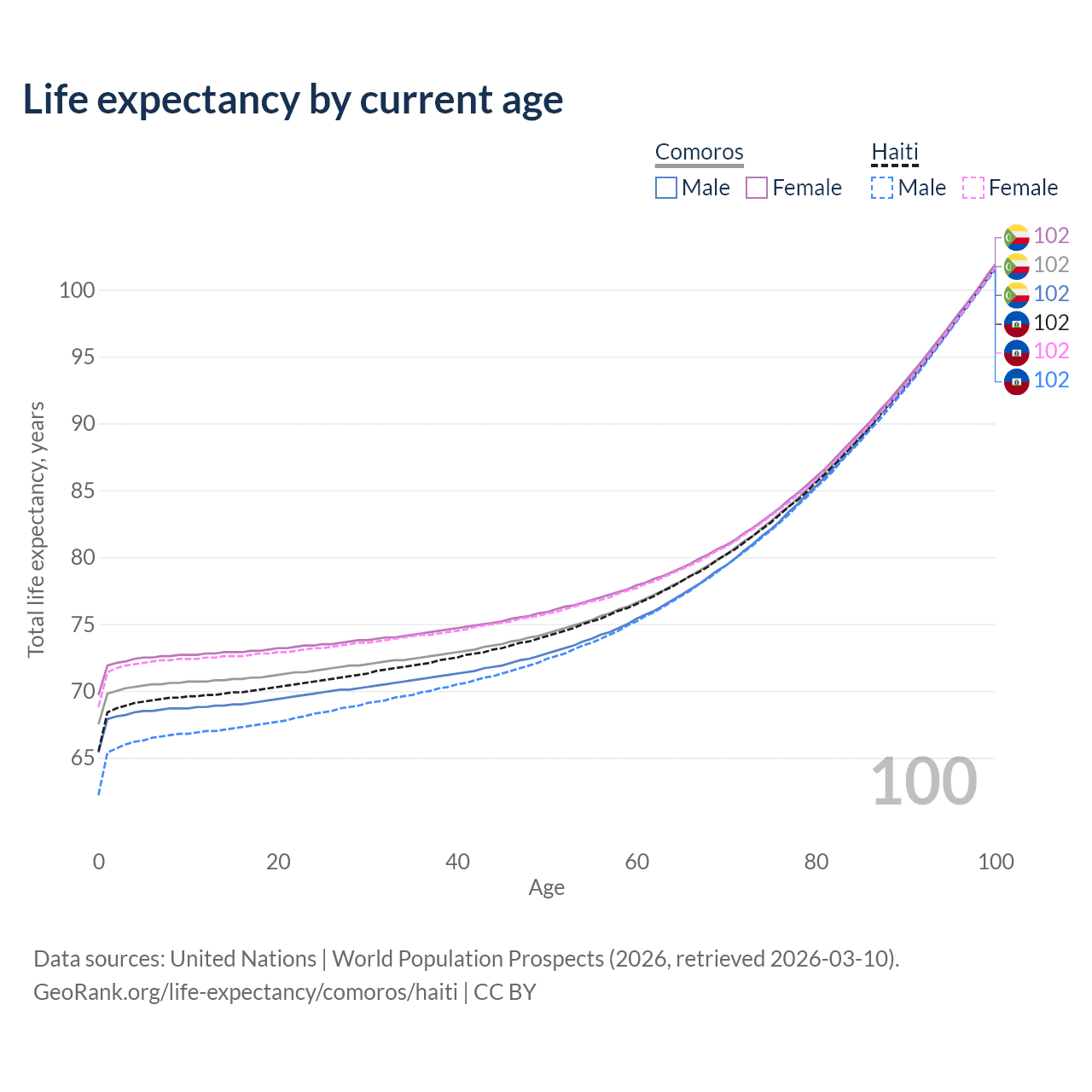 This life expectancy calculator shows the odds of living to 100, 95, 90, and below based on current age for both males and females in Comoros and Haiti, along with mean and median age of death. The calculations are based on the 2026 life tables (actuarial tables) from the UN World Population Prospects.