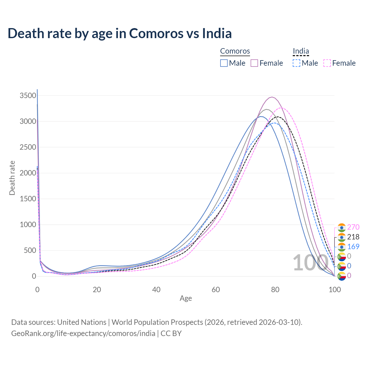 In Comoros, the most common age of death is 0, compared to 81 in India. The median age of death is 72.9 in Comoros and 76.8 in India, meaning only half of each cohort is expected to live past that age.