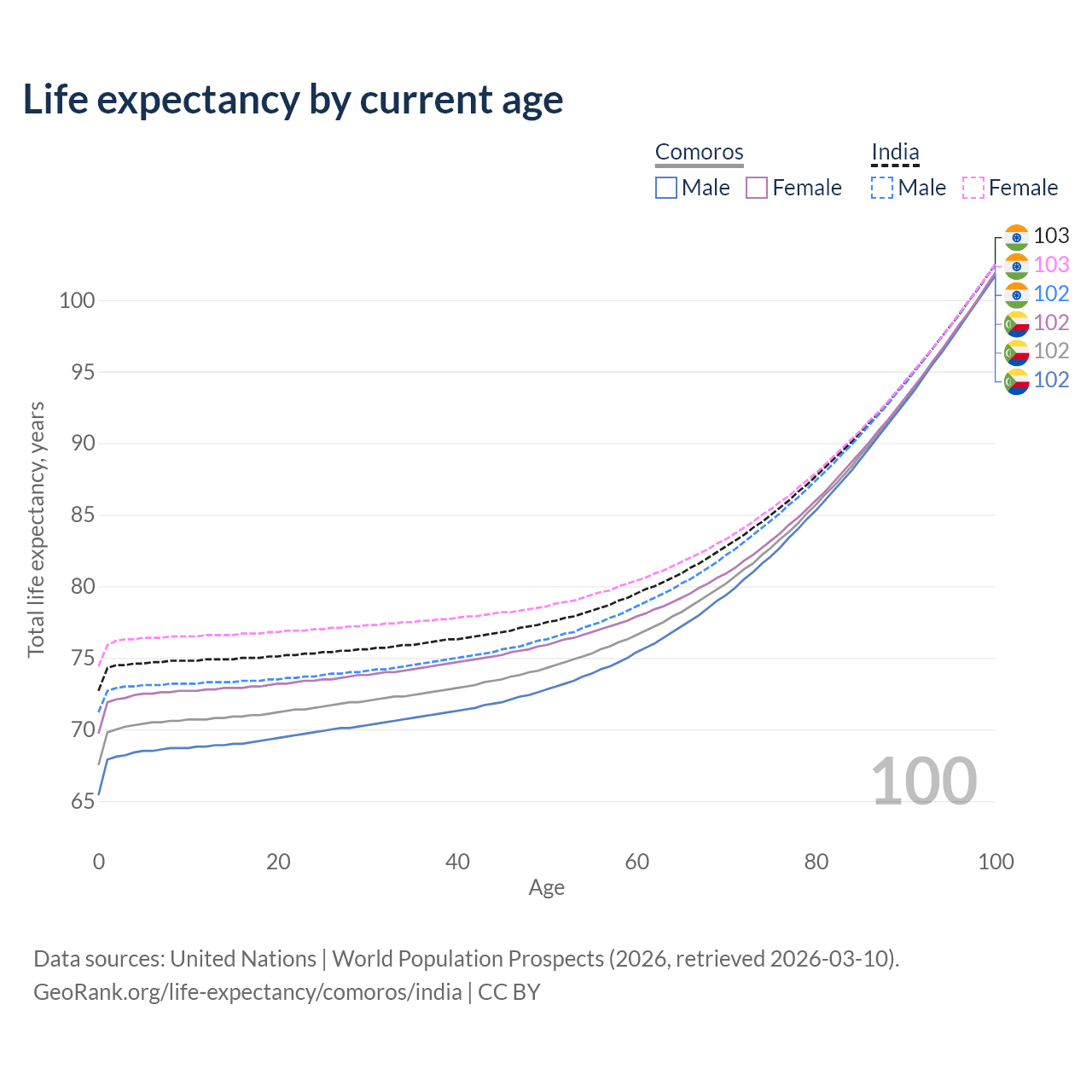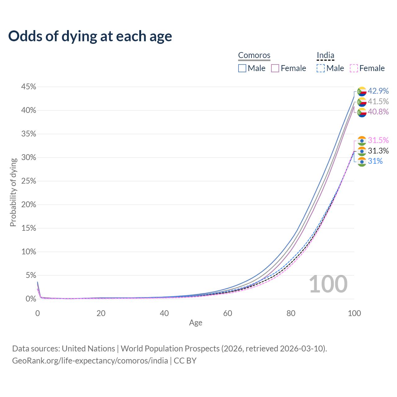 This life expectancy calculator shows the odds of living to 100, 95, 90, and below based on current age for both males and females in Comoros and India, along with mean and median age of death. The calculations are based on the 2026 life tables (actuarial tables) from the UN World Population Prospects.
