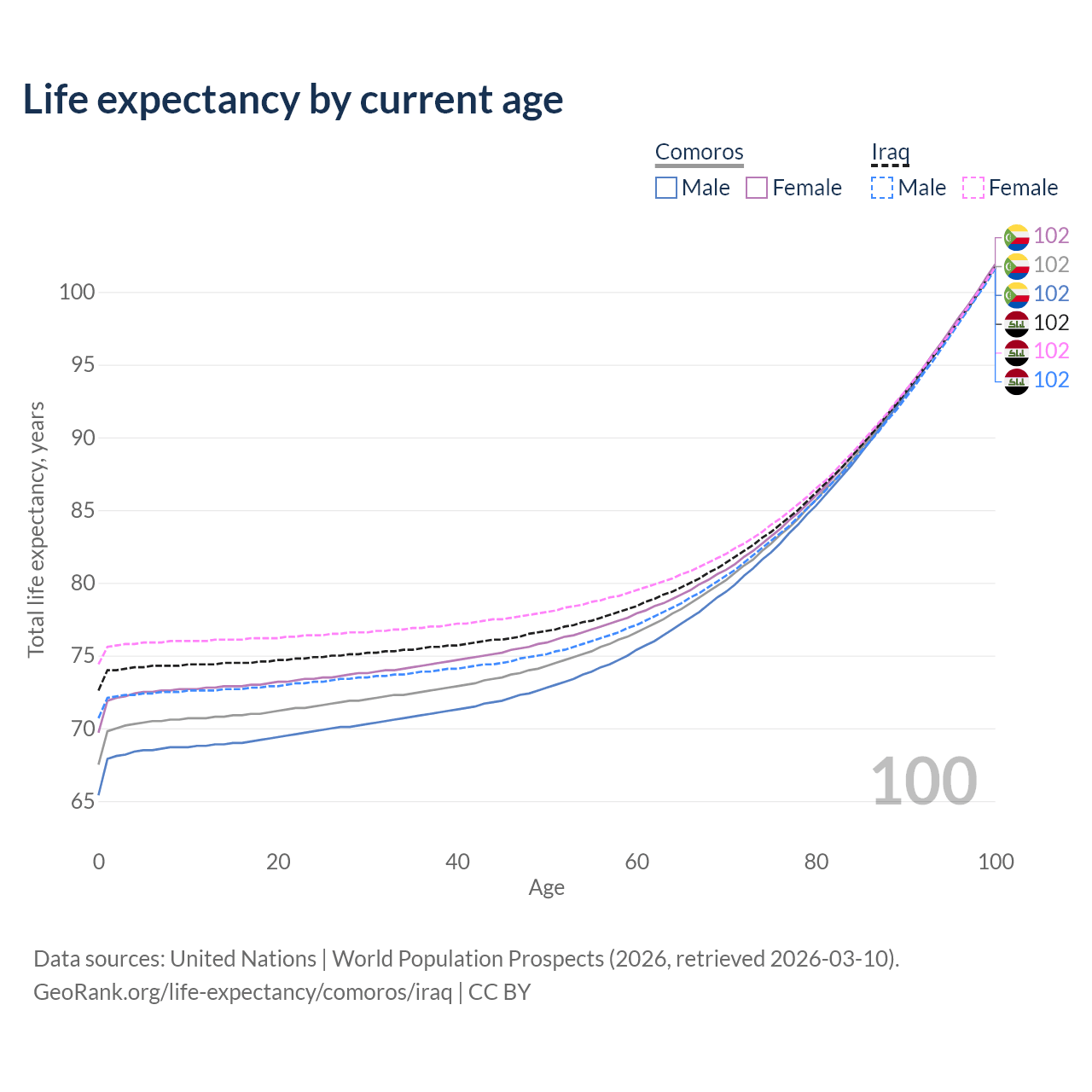 This life expectancy calculator shows the odds of living to 100, 95, 90, and below based on current age for both males and females in Comoros and Iraq, along with mean and median age of death. The calculations are based on the 2026 life tables (actuarial tables) from the UN World Population Prospects.